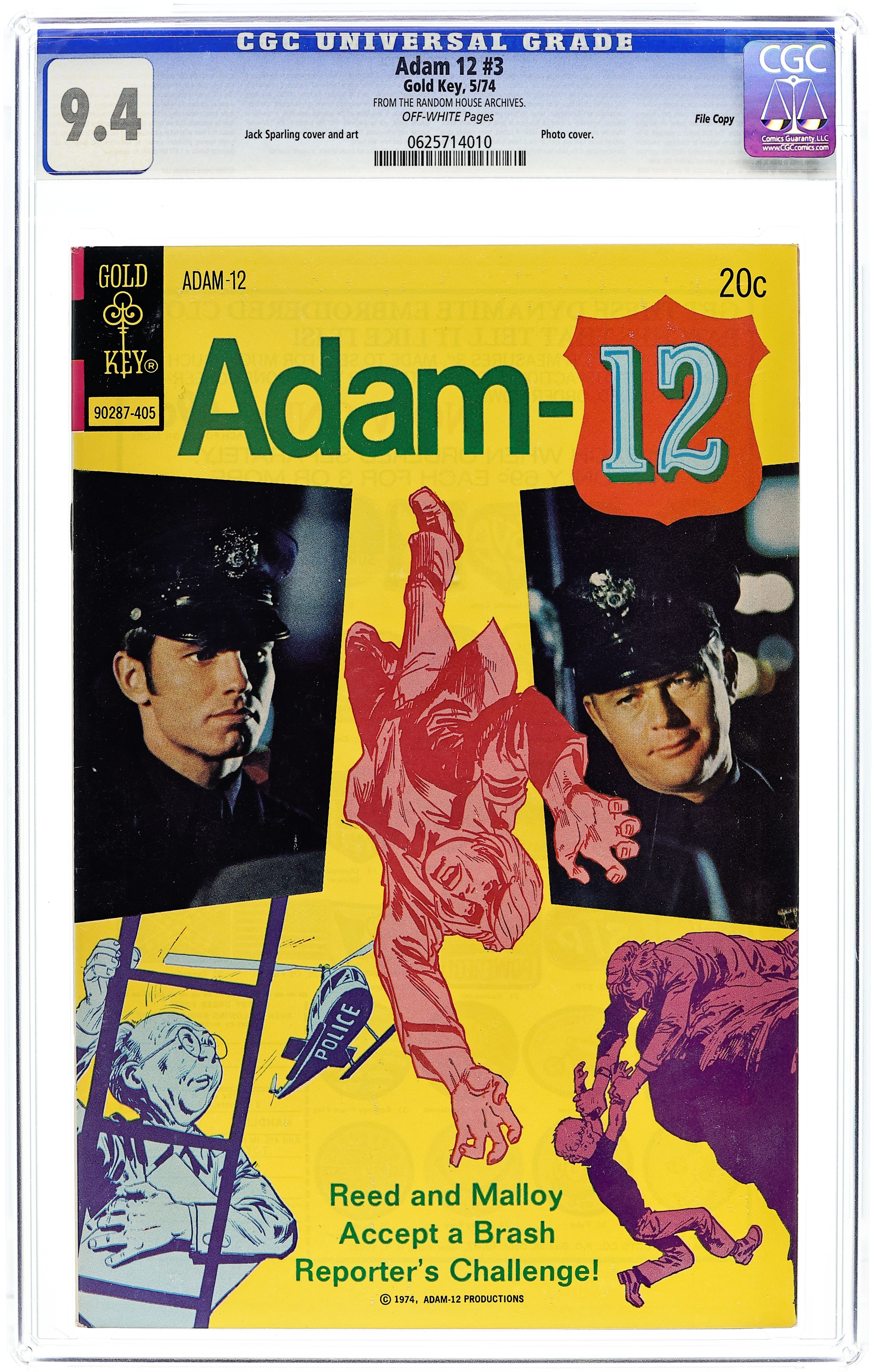 Photo cover. Comic book based on the TV police drama Adam 12 which aired from 1968 to 1975. Officers Pete Malloy and Jim Reed in "Reason To Live" in which the officers have a reporter riding along with them and observing and "The Experiment" in which the officers deal with a nervous bank robber. No story/art credits given. Cover price $0.20.