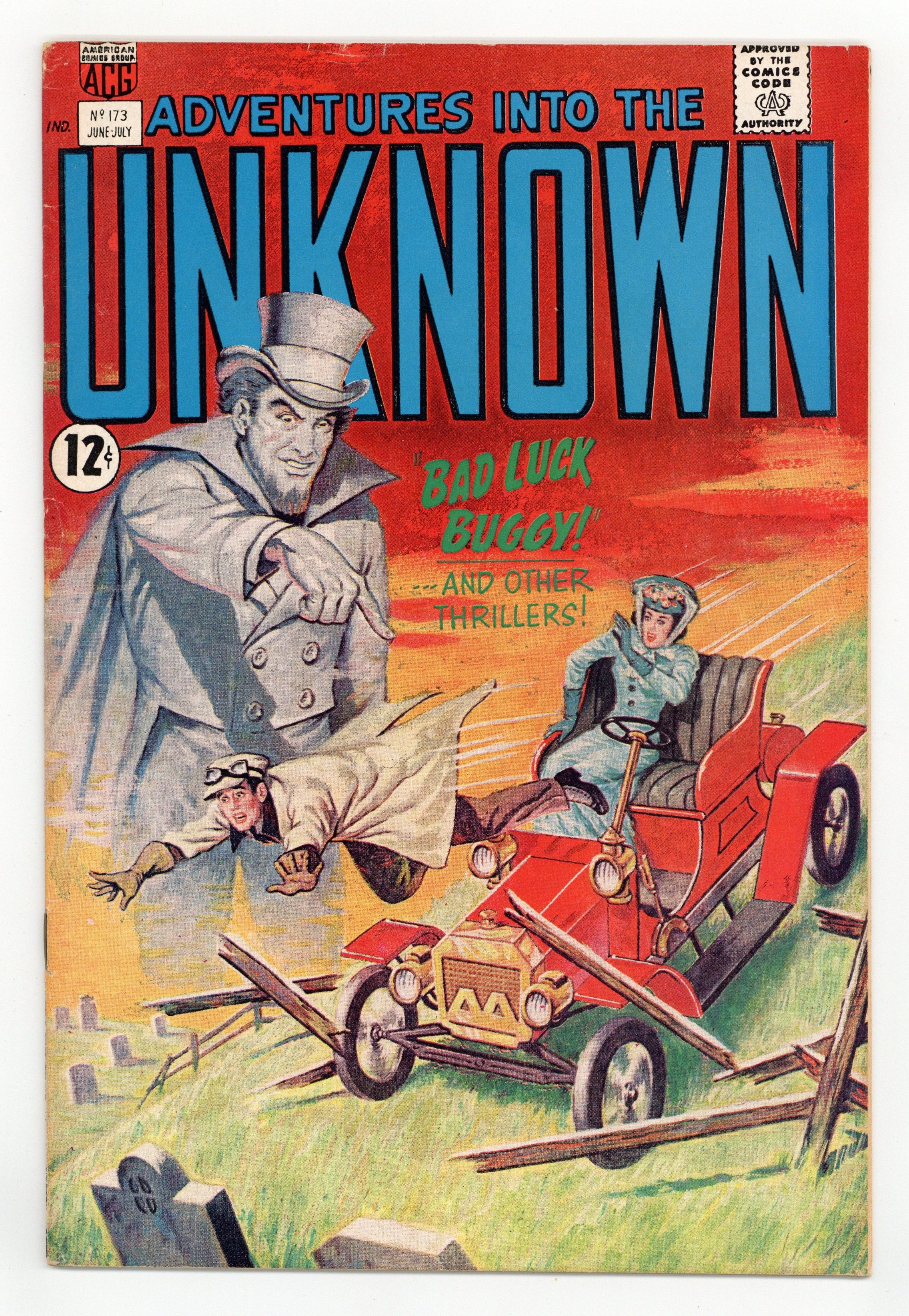 Edited by Richard E. Hughes. Cover by Edvard Moritz. Stories by Richard Hughes (as Sven Larsen and Shane OShea, and as himself), Sal Trapani, Pete Costanza, Paul Reinman, and George Wilhelms. Spine-chilling tales of suspense, horror, and the supernatural—prepare yourself for Adventures into the Unknown! 36 pages, full color. Cover price $0.12.