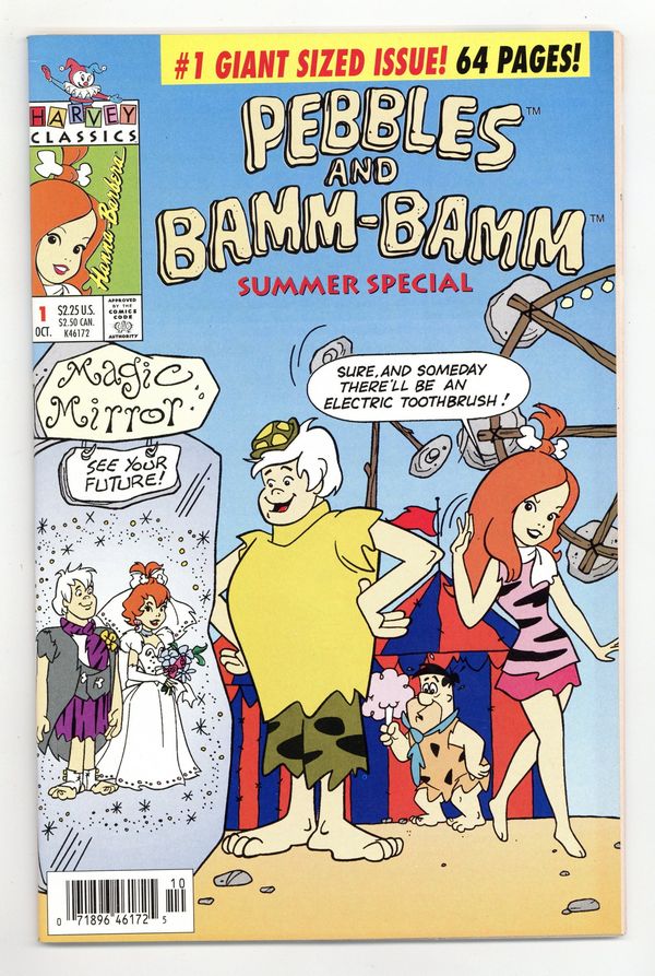 $16.00Cover by Scott Shaw! and Jorge Pacheco. Stories and art by Gwen Krause and Ray Dirgo. A revived Harvey Comics presents classic strips featuring Pebbles and Bamm-Bamm, teenage children of the Flintstone and Rubble families. The gang decides to sign up for self-defense classes. Bamm-Bamm saves an oblivious Fred from many dangers when they visit the fair. Whos the Loveliest of All?; The Great Lover; Judo, Anyone?; Late Date; The Name of the Game; Bedlam in Bedrock; Stung Again; Dont Bet on a Pet; Rubber Worm; Fun at the Fair. 64 pages, Full Color. Cover price $2.25.