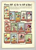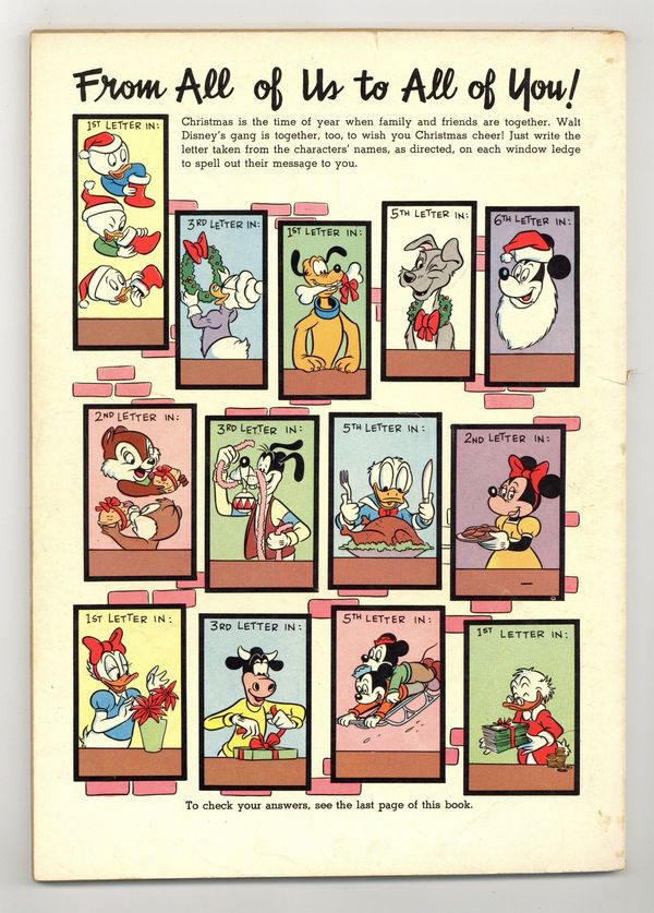 Cover pencils by Tony Strobl, inks by Norm McGary. The Christmas Cha Cha, script and art by Carl Barks; Donald practices the cha cha so that he can win the first prize in a dance contest, a silver bowl, with Daisy, and give her his half of the bowl as a Christmas gift; But Scrooge is supposed to supply the bowl, and so he enters the contest, too, with a dance teacher as his partner. The Moose Head Mystery, script by Nick George, art by Paul Murry. The Topsy-turvy Tree starring Chip 'n' Dale, script by Vic Lockman, art by Al Hubbard. A Gift for Santa, script by Del Connell, art by Pete Alvarado. The Gullible Guard starring Pluto, art by Jack Bradbury. The Bear Claus starring Brer Rabbit, art by Al Hubbard. Christmas Around the World, art by Al Hubbard. 84 Pages, Full Color. Cover price $0.25.