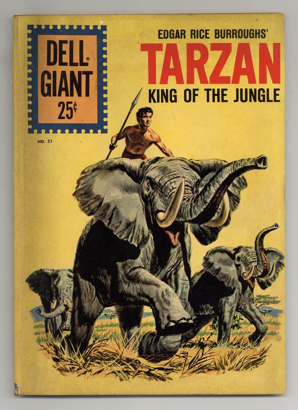 Painted cover art. The Tree of Ages, script by Gaylord Du Bois, art by Jesse Marsh; Captain Smith's plane crashes while he is searching for the Unknown Tree and Tarzan sets out to rescue him. The Axe of Mumbo, script by Gaylord Du Bois, art by Jesse Marsh; Boy, Dombie and Buto track some native poachers. Dassie; After losing her own litter, Dassie raises a pair of orphaned cheetahs. The Sultan's Ruby, script by Gaylord Du Bois, art by Sparky Moore; When Jane's pet ostrich steals the ruby necklace given to her by another tribe she must find it before a tribal war erupts. Jane's Jungle Jewelry activity page. The Courage of Pan-At-Lee, script by Gaylord Du Bois, art by Jesse Marsh; Tarzan and Pan-At-Lee rescue her husband Om-At from the Hu-Don tribe. Boy and Dombie pin-up back cover. 84 Pages, Full Color. Cover price $0.25.