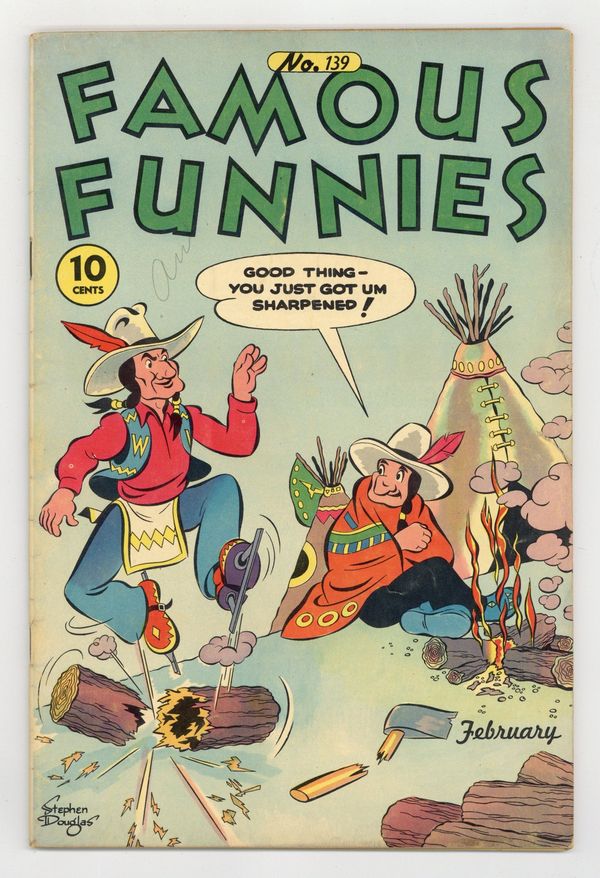 Tags: Comic Strip ReprintsPublished Feb 1946 by Famous Funnies.$23.00Contains comic strip reprints, activity pages, and a text story. In order of appearance: "Buck Rogers" by Philip Francis Nowlan and Rick Yager (as Dick Calkins); "Invisible Scarlet O'Neil" by Russell Stamm; "Chief Wahoo" by Allen Saunders and Elmer Woggon; "Dickie Dare" by Milton Caniff; "Napoleon" by Clifford McBride; "Scorchy Smith" by Noel Sickles; "Jitter" by Arthur B. Poinier; "Life's Like That" by Fred Neher; and "Oaky Doaks" by Ralph Briggs Fuller. "They Also Serve" text story by Carl G Hodges. Activity pages by A. W. Nugent. 52 pages. Full color. Cover price $0.10.