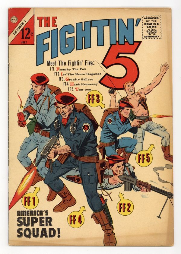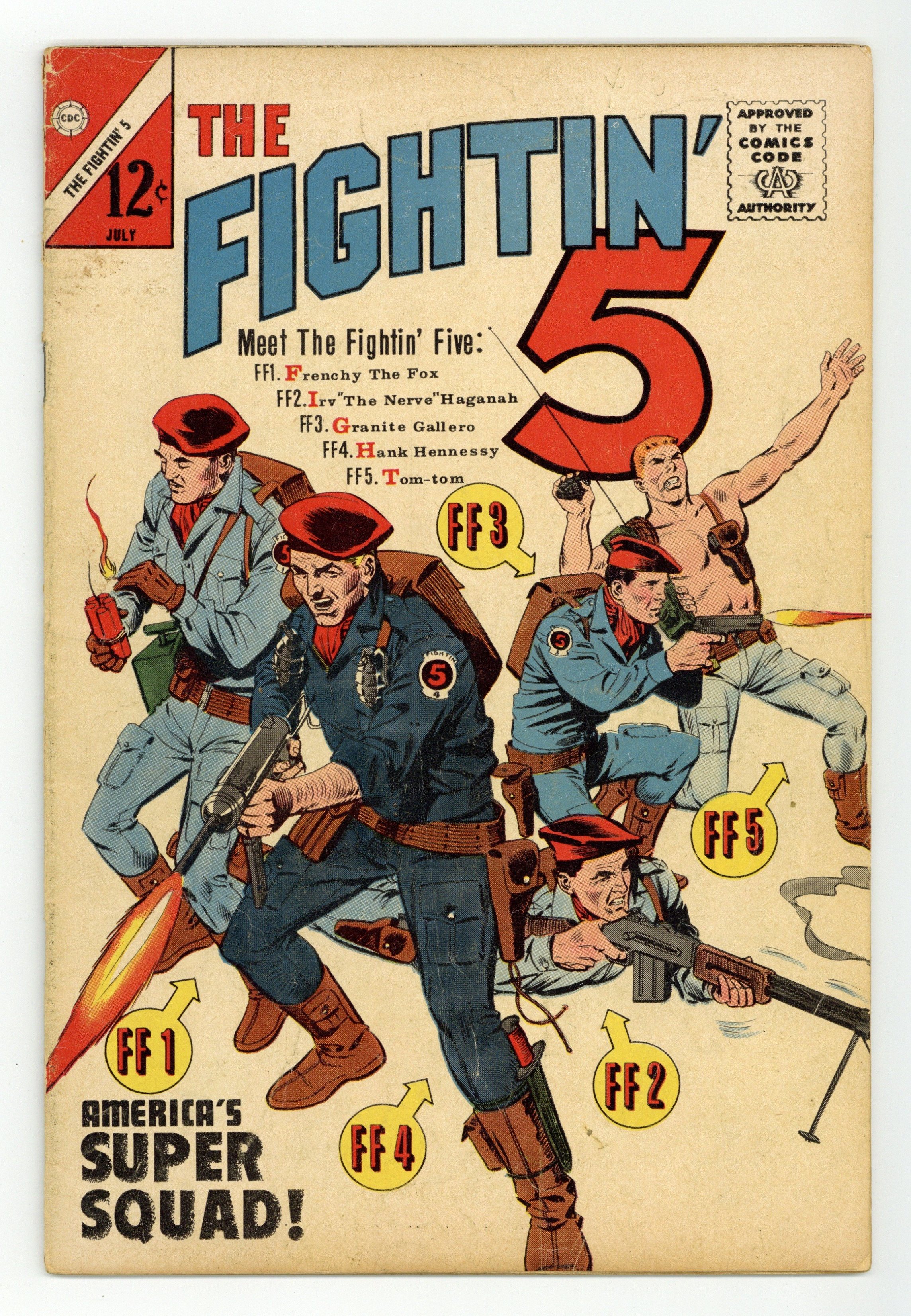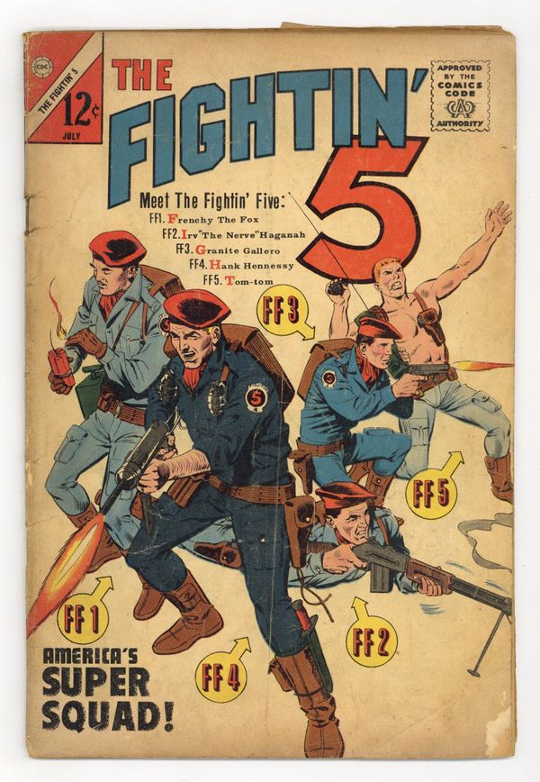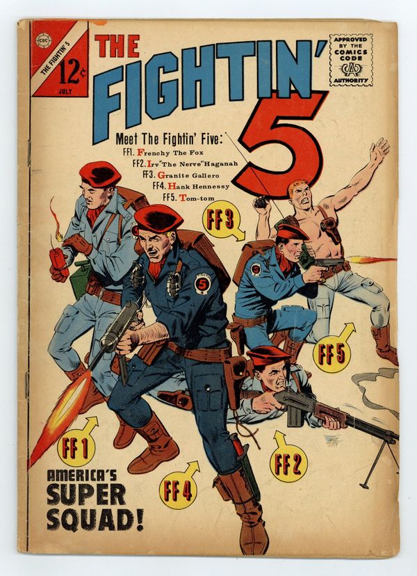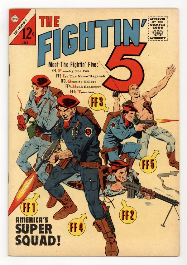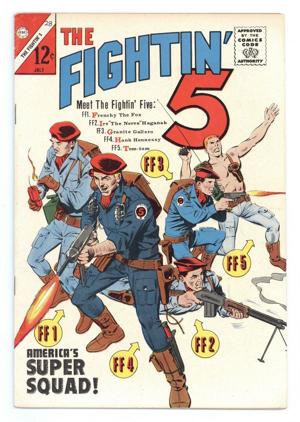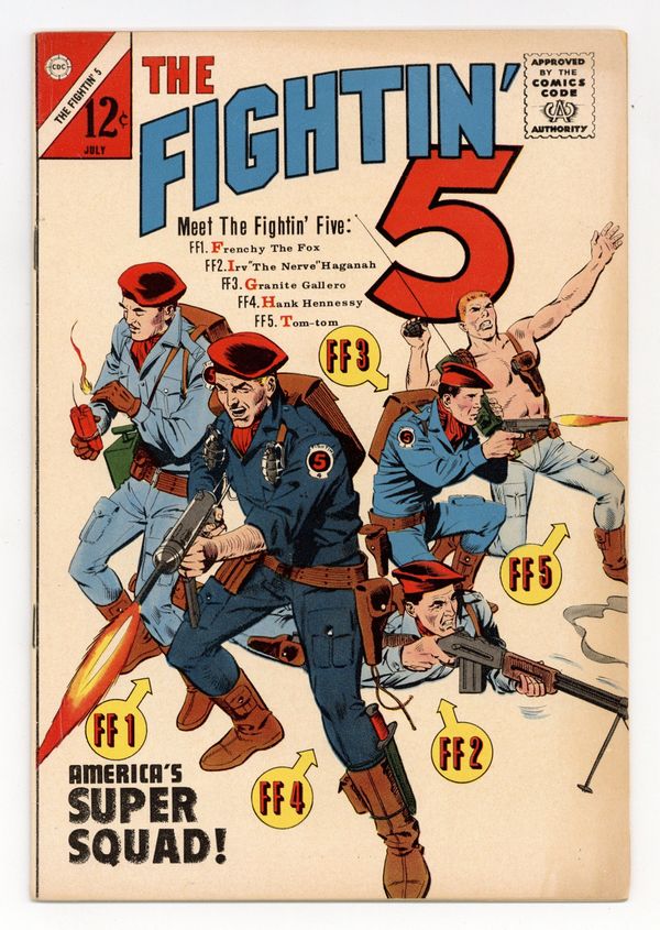 Published Jul 1964 by Charlton Comics Group.$32.00Cover by Dick Giordano. Stories and art by Bill Montes, Bill Molno and Joe Gill. Numbering continues from Space War (1959) #27. Five tough guys form a specialized combat unit for specialized missions. In this debut issue, Hank Hennesey, Tom-Tom, Irv "the Nerve" Haganah, Frenchy the Fox and Granite Gallero are gathered into "America's Super Squad" and sent on their first mission. Introducing the Fightin Five, Americas Super Squad; The Looter; Jungle Death; The Story of the Medal; American Pioneer. 32 pages, Full Color. Cover price $0.12.