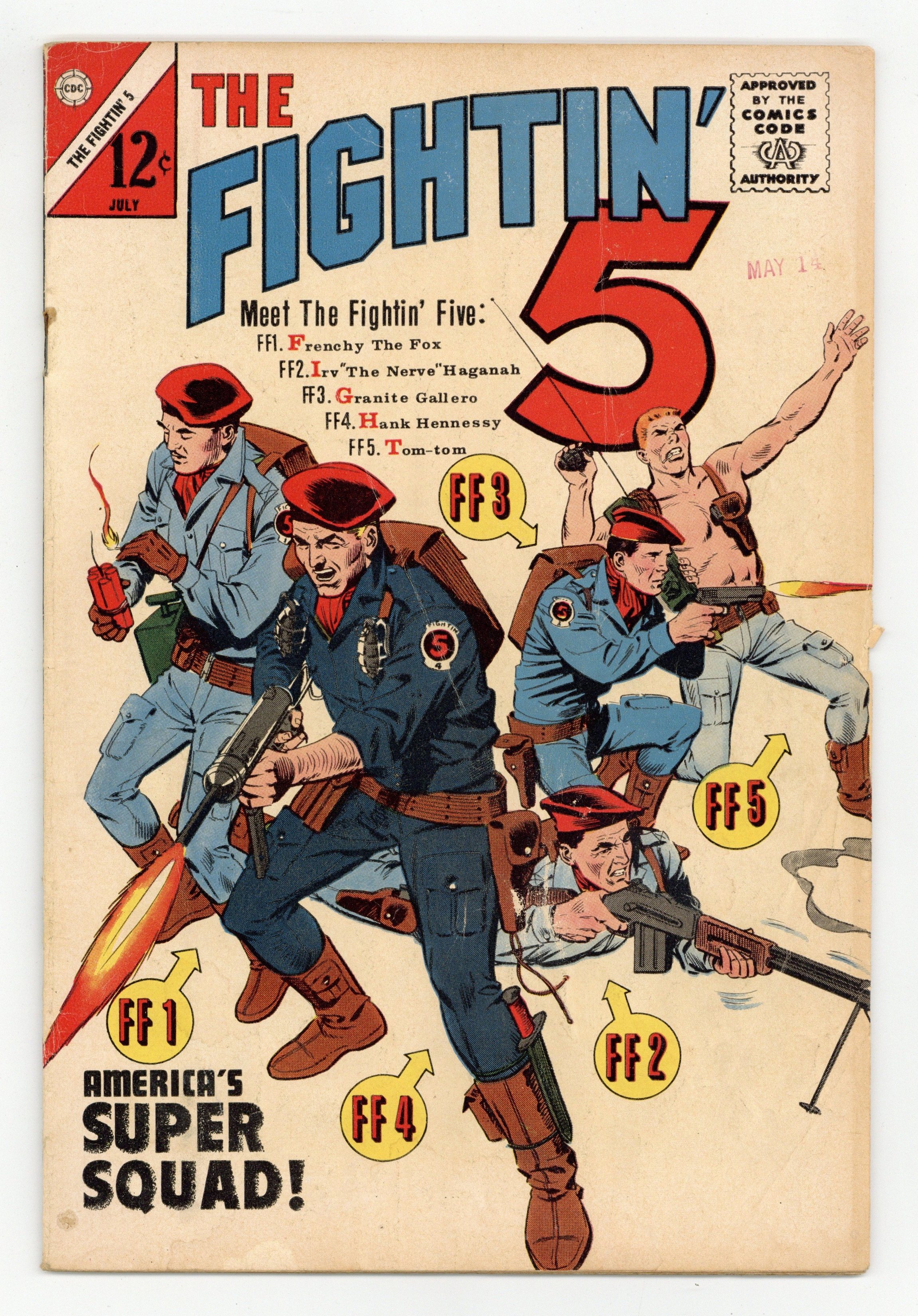 Published Jul 1964 by Charlton Comics Group.$29.00Cover by Dick Giordano. Stories and art by Bill Montes, Bill Molno and Joe Gill. Numbering continues from Space War (1959) #27. Five tough guys form a specialized combat unit for specialized missions. In this debut issue, Hank Hennesey, Tom-Tom, Irv "the Nerve" Haganah, Frenchy the Fox and Granite Gallero are gathered into "America's Super Squad" and sent on their first mission. Introducing the Fightin Five, Americas Super Squad; The Looter; Jungle Death; The Story of the Medal; American Pioneer. 32 pages, Full Color. Cover price $0.12.