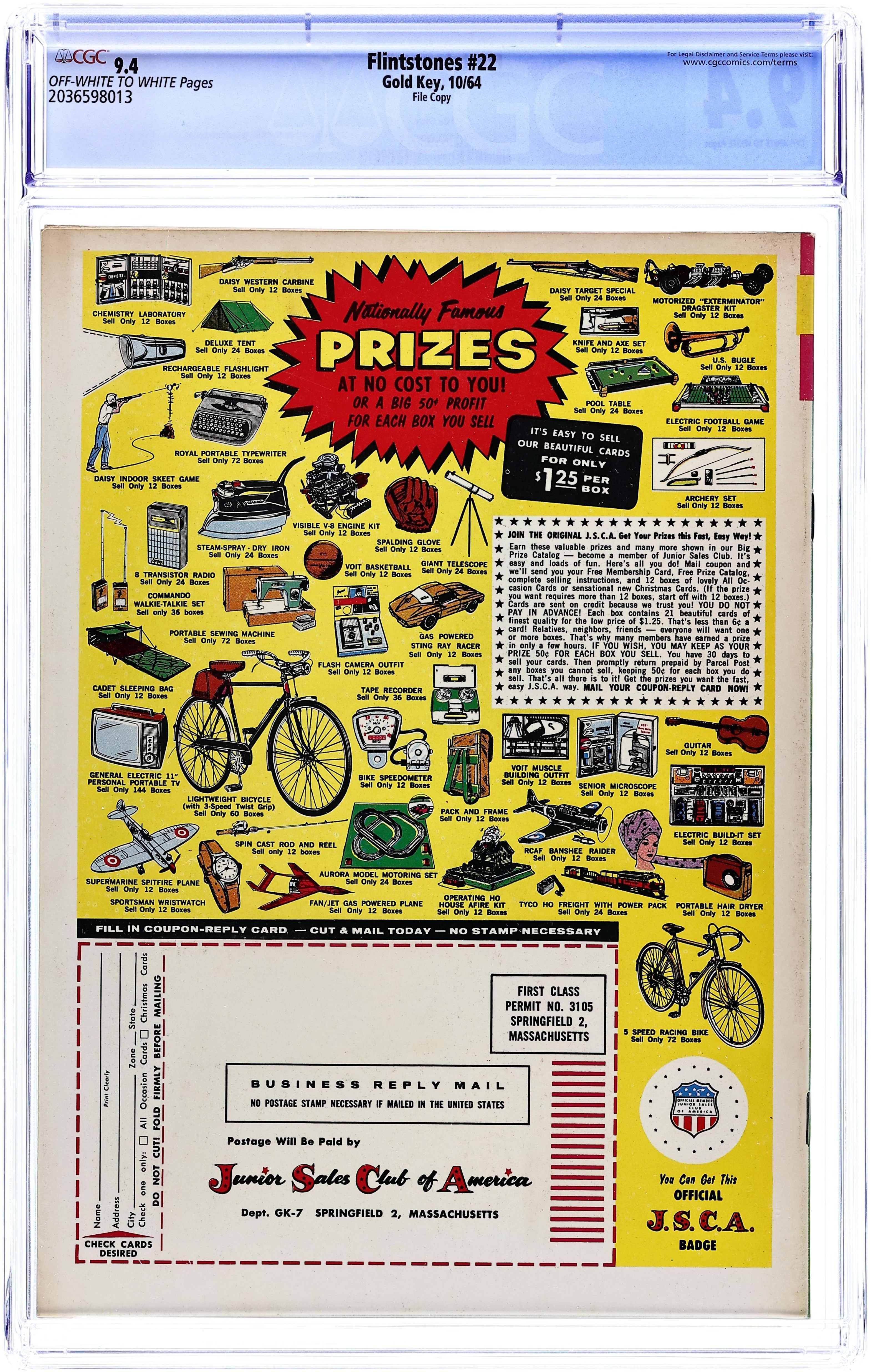 Cover title says "The Flintstones with Pebbles." The Flintstones in: "Money Matters...A Lot," "The Hobby Habit," "The Strange Case of the Sprained Toe," (with guest star Ben Cagey, the Flintstones version of 1960s TV doctor Ben Casey) and "The Explorers." Issue also has Mr. & Mrs. J. Evil Scientist in "Flying By Scareplane" and a one-page text story "Who Has the Clue?" No art/story credits given. 36 pages, full color. Cover price $0.12.