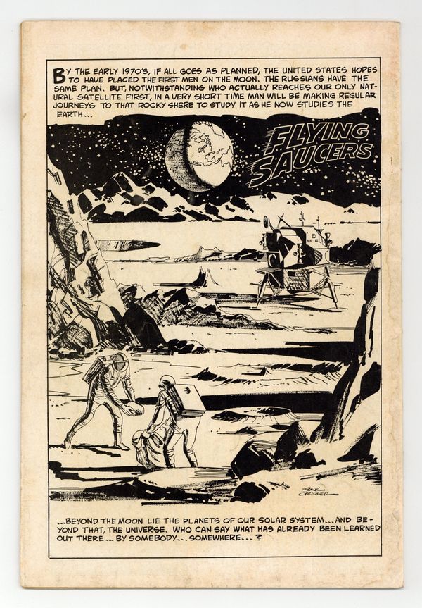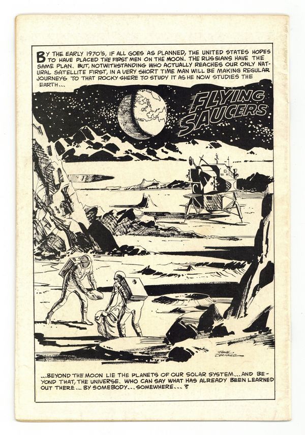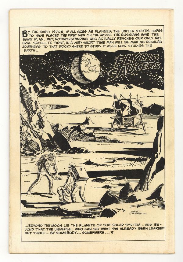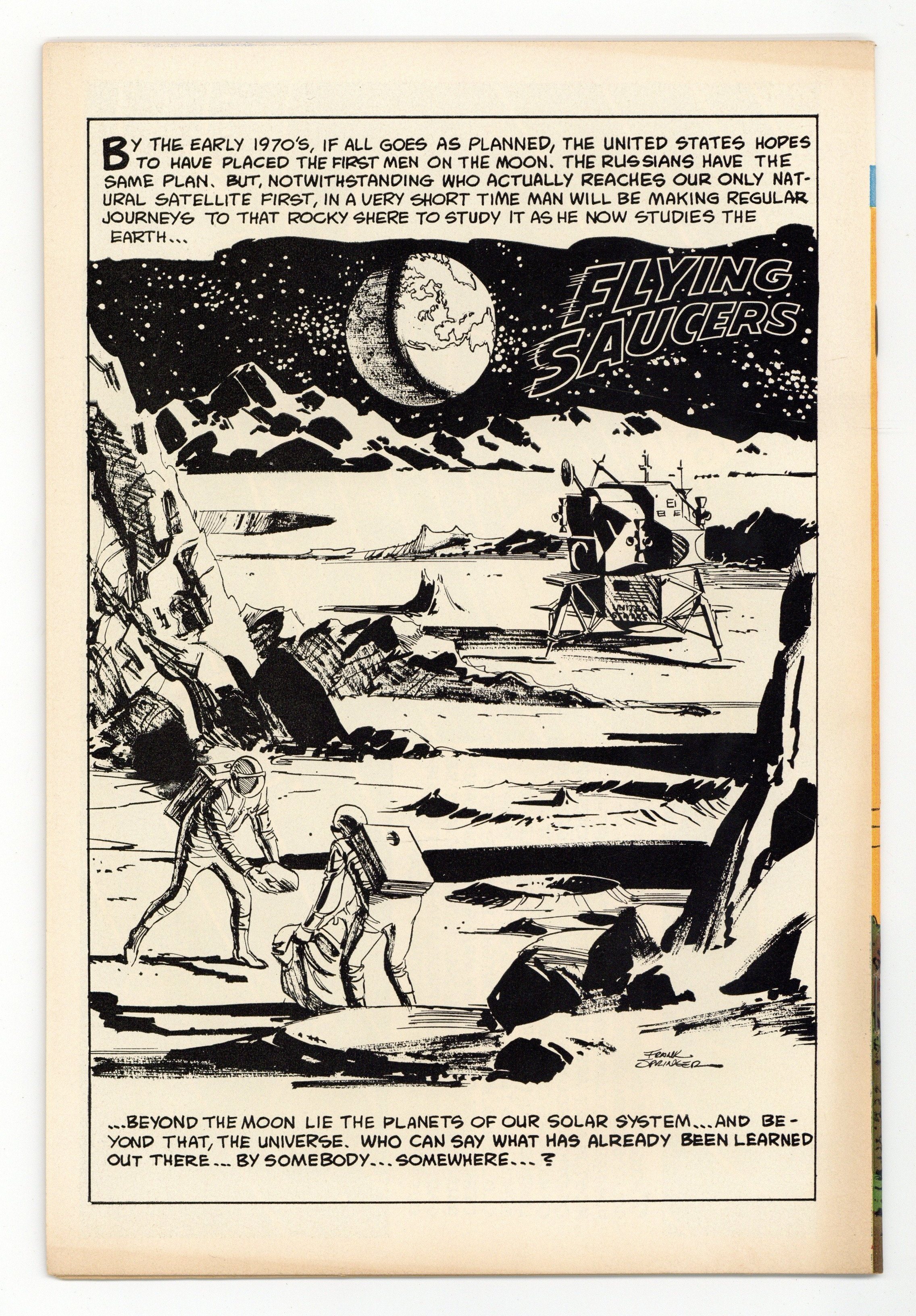 Cover by Frank Springer. Stories by Don Segall and unknown. Art by Chic Stone, Jose Delbo, Sam Glanzman, Sal Trapani and Frank Springer. Unbelievable accounts of bizarre sightings of UFOs....and the "men' who fly them! Featuring the tales "Night Sighting," "The Devil Ship," "Far Out Physical," "Strange Shoot Out" and "Collision Course"! Plus: two untitled 1-page stories! 36 pages, full color. Cover price $0.12.