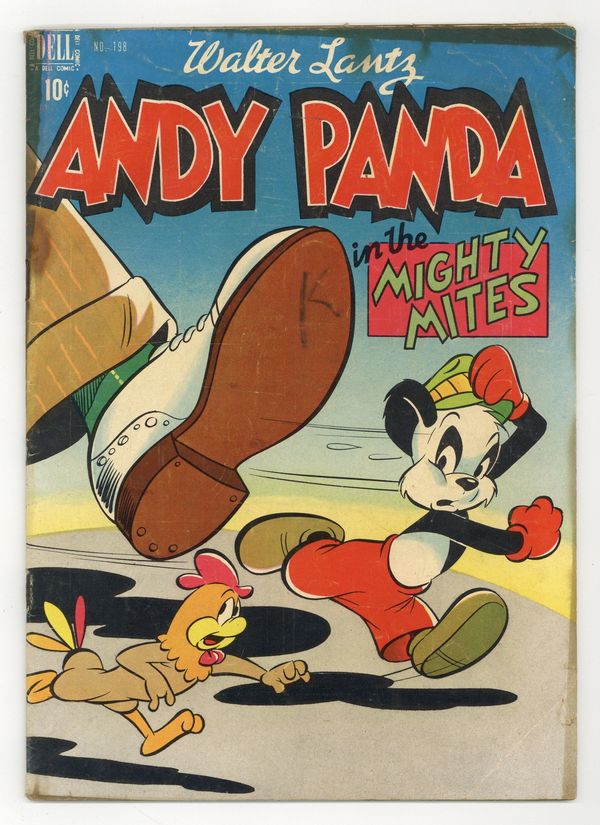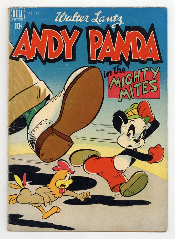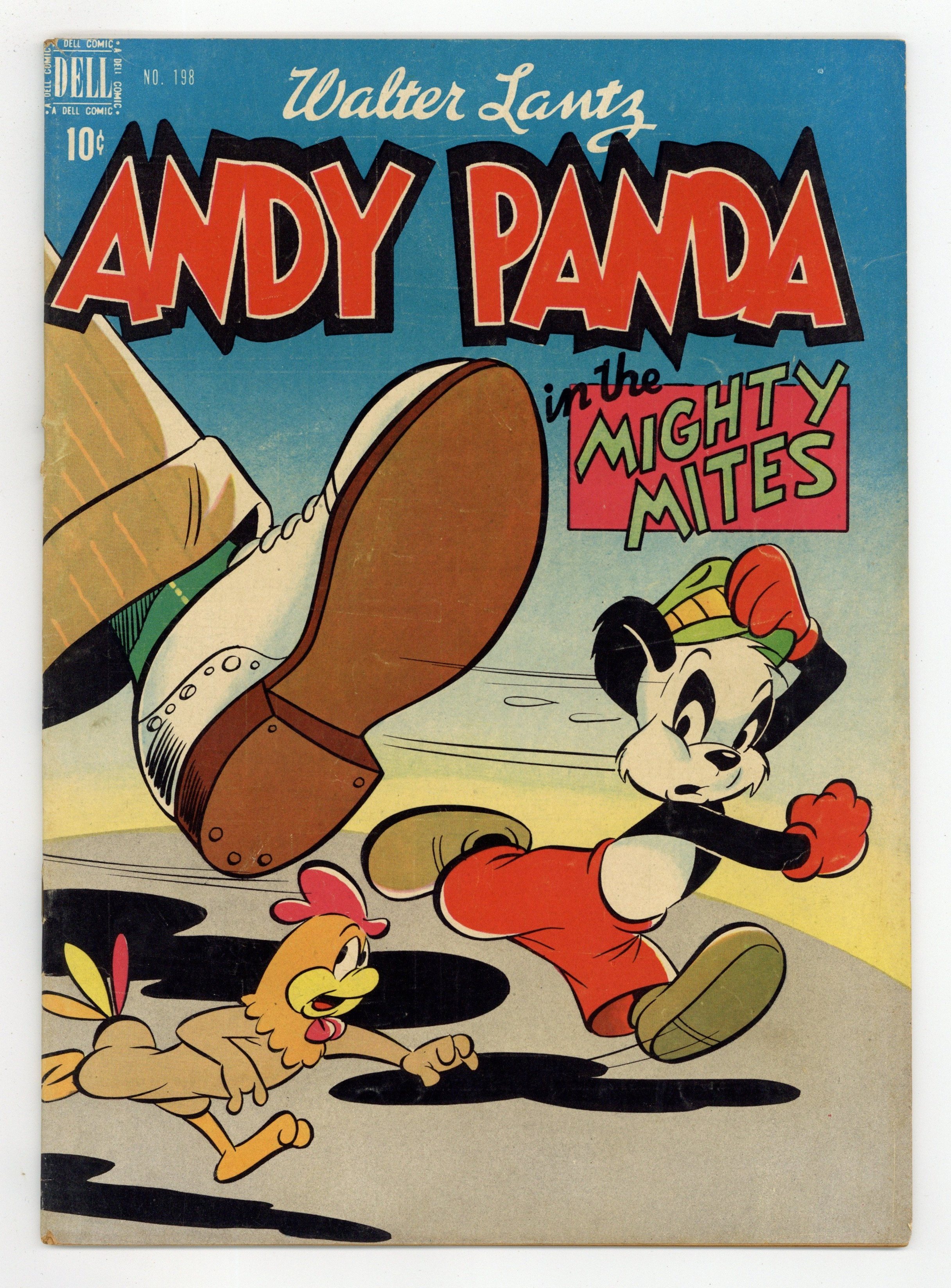 Indicia title is Walter Lantz ANDY PANDA in The MIGHTY MITES, No. 198. Cover art by Dan Gormley. The Mighty Mites, script by John Stanley, art by Dan Gormley; When their car is stuck in the mud on a back road, Andy and Charlie make their way to an isolated house where they are captured by Mr. Morgan, who has invented a reducto ray, which is capable of shrinking people to four inches high. Andy and the Squirrel back cover strip, art by Dan Gormley; Andy is sleeping on a park bench with his mouth open; A squirrel decides that would be a good place to hide an acorn. 36 pages, full color. Cover price $0.10.
