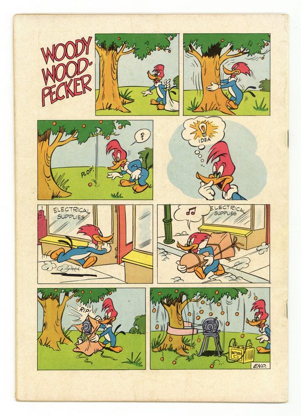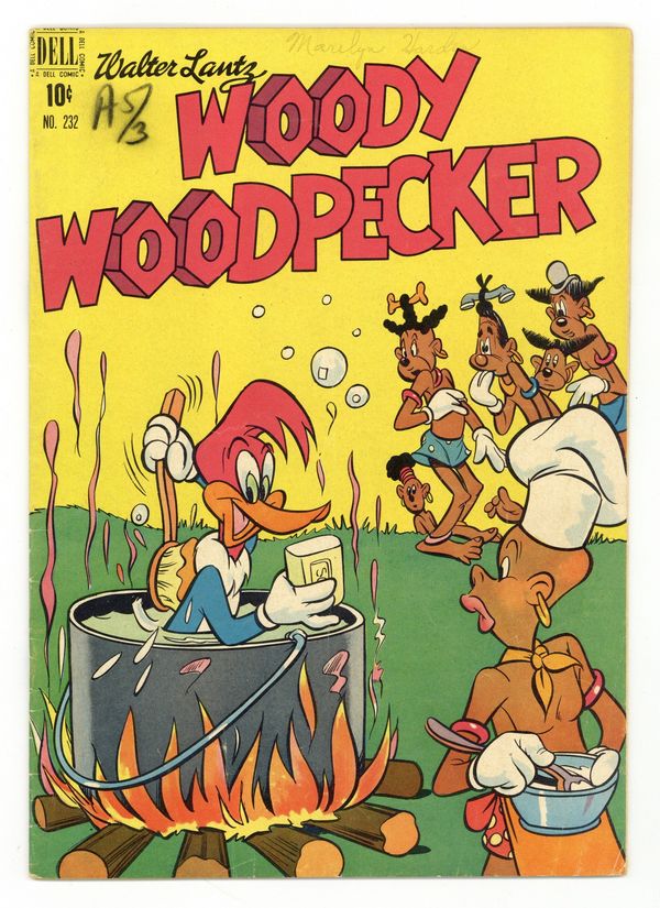 $51.30Indicia title is "Walter Lantz WOODY WOODPECKER, No. 232. Cover art by Dan Gormley. Professor Packaderm and the Elephants' Graveyard, art by Dick Hall; Woody joins Professor Packaderm in an expedition to the Ivory Coast to find the "Elephants' Graveyard." 36 pages, full color. Cover price $0.10.