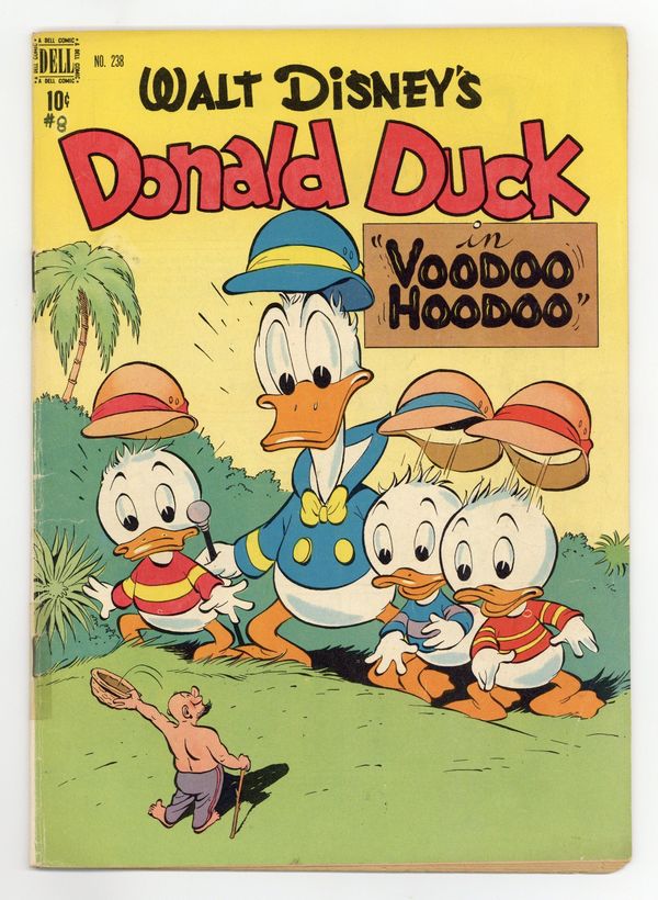 Indicia title is "Walt Disney's DONALD DUCK in VOODOO HOODOO, No. 238." Cover art by Carl Barks. Voodoo Hoodoo, script and art by Carl Barks; A zombie gives Donald a poisoned doll that was intended for Uncle Scrooge, who looked like Donald when the doll was given to the Zombie some seventy years before; Donald--followed by the nephews and "Bombie the Zombie"--goes to Africa to persuade the witch doctor Foola Zoola to give him the antidote for the poison, which is supposed to shrink its victims to the size of a rat. 3 one-page Barks strips. 36 pages, full color. Cover price $0.10.