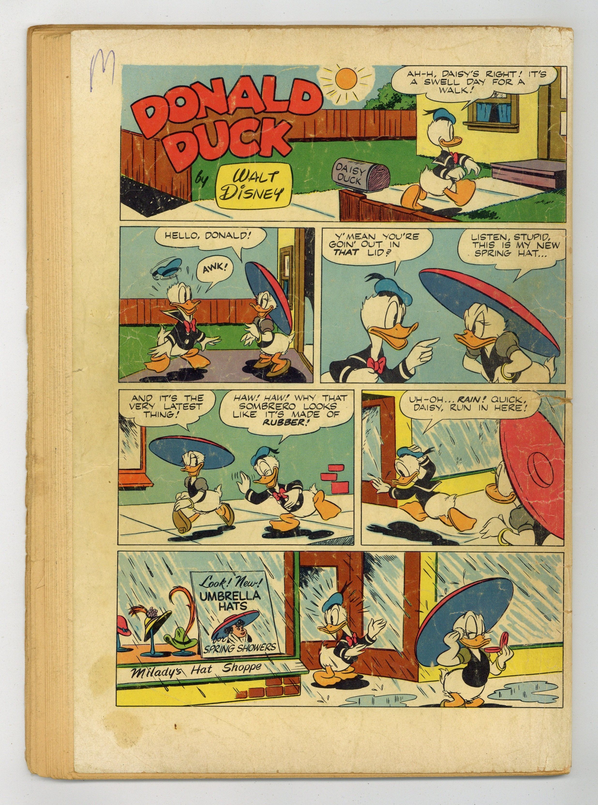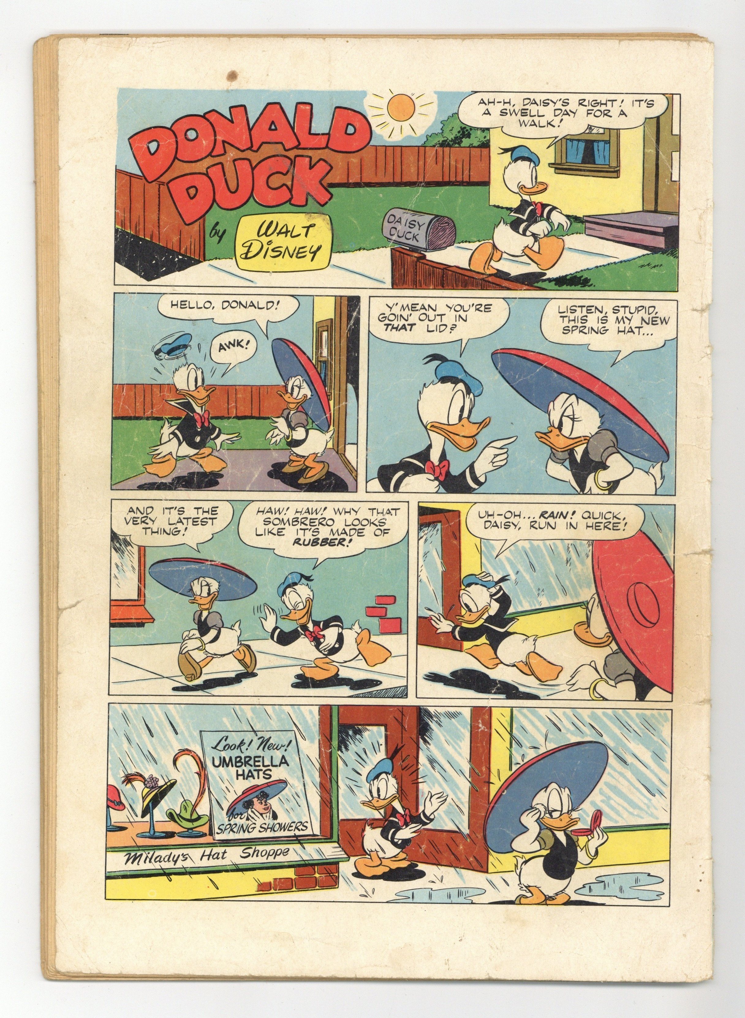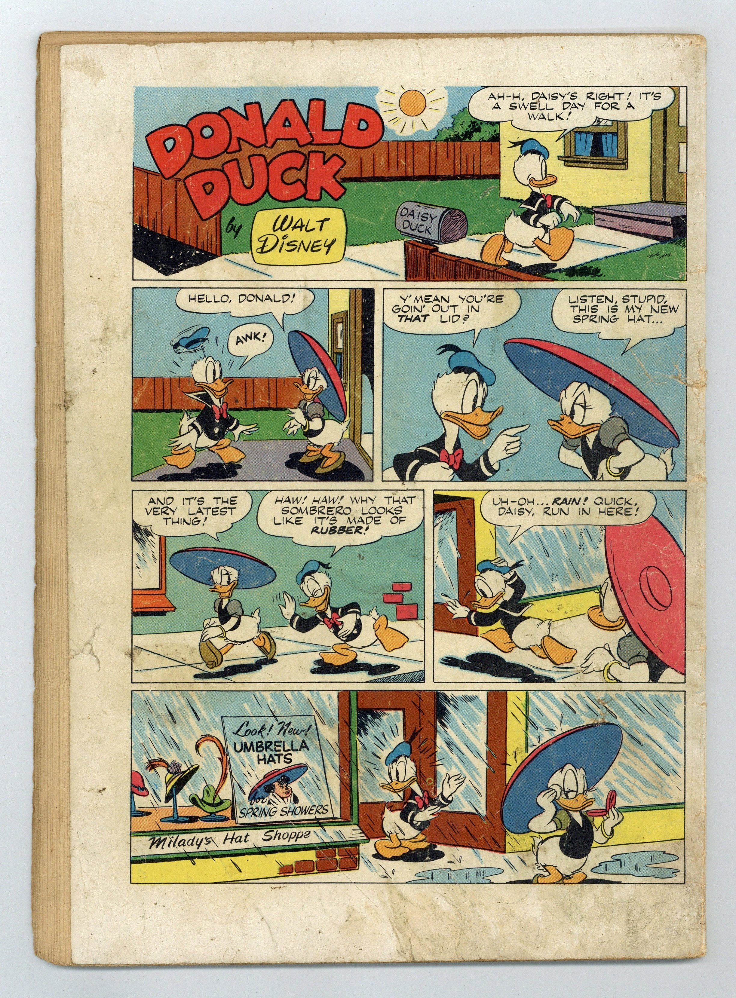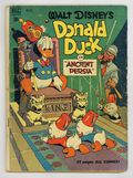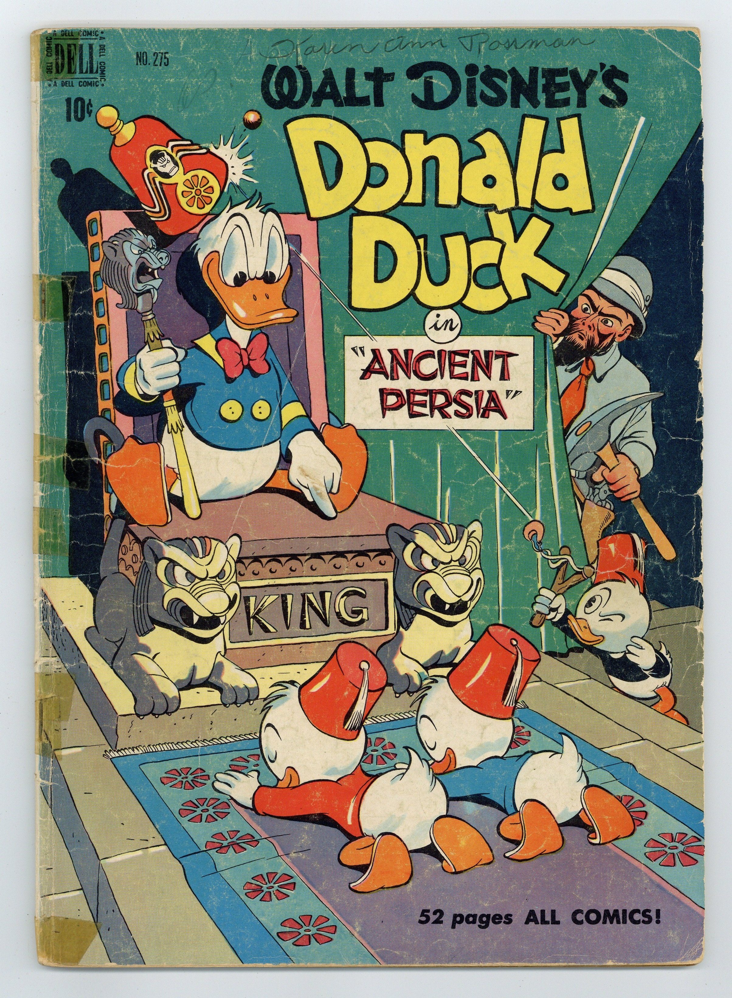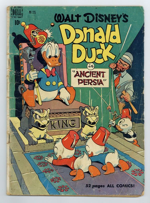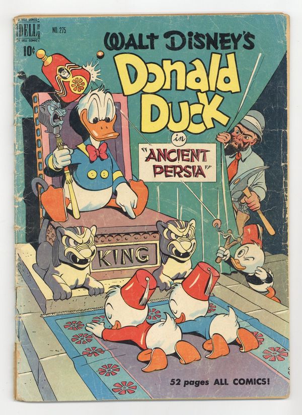 Indicia title is "Walt Disney's DONALD DUCK in ANCIENT PERSIA, No. 275." Cover art by Carl Barks. Donald Duck in Ancient Persia, script and art by Carl Barks; The ducks are kidnapped by a mysterious scientist and flown to Persia, where they dig into an ancient city, Itsa Faka. Jet-Job Joes, art by Paul Murry; The nephews want to enter their racer in a race, but Donald doesn't want them to go very fast. Rules 'n' Regulations, art by Paul Murry; Tired of the nephews messing up the house, Donald makes a set of rules that they have to follow; To escape the regulations, the nephews build a houseboat. 52 pages, full color. Cover price $0.10.