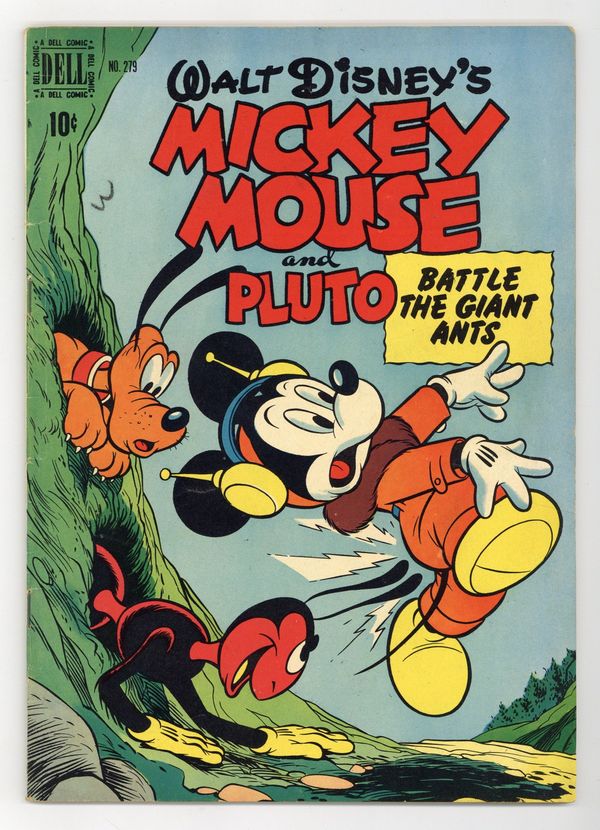 Indicia title is "Walt Disney's MICKEY MOUSE and PLUTO BATTLE THE GIANT ANTS, No. 279." Cover art by Bill Wright. Mickey Mouse and Pluto Battle the Giant Ants, script and art by Bill Wright; While on a plane trip over the uncharted Amazon jungle, Mickey and Goofy discover a city of giant ants who speak in Morse Code signals through their antennas. Monkey Business, art by Tony Strobl; Morty and Ferdie adopt two monkeys, who cause general havoc for Mickey and the rest of the town. 52 pages, full color. Cover price $0.10.