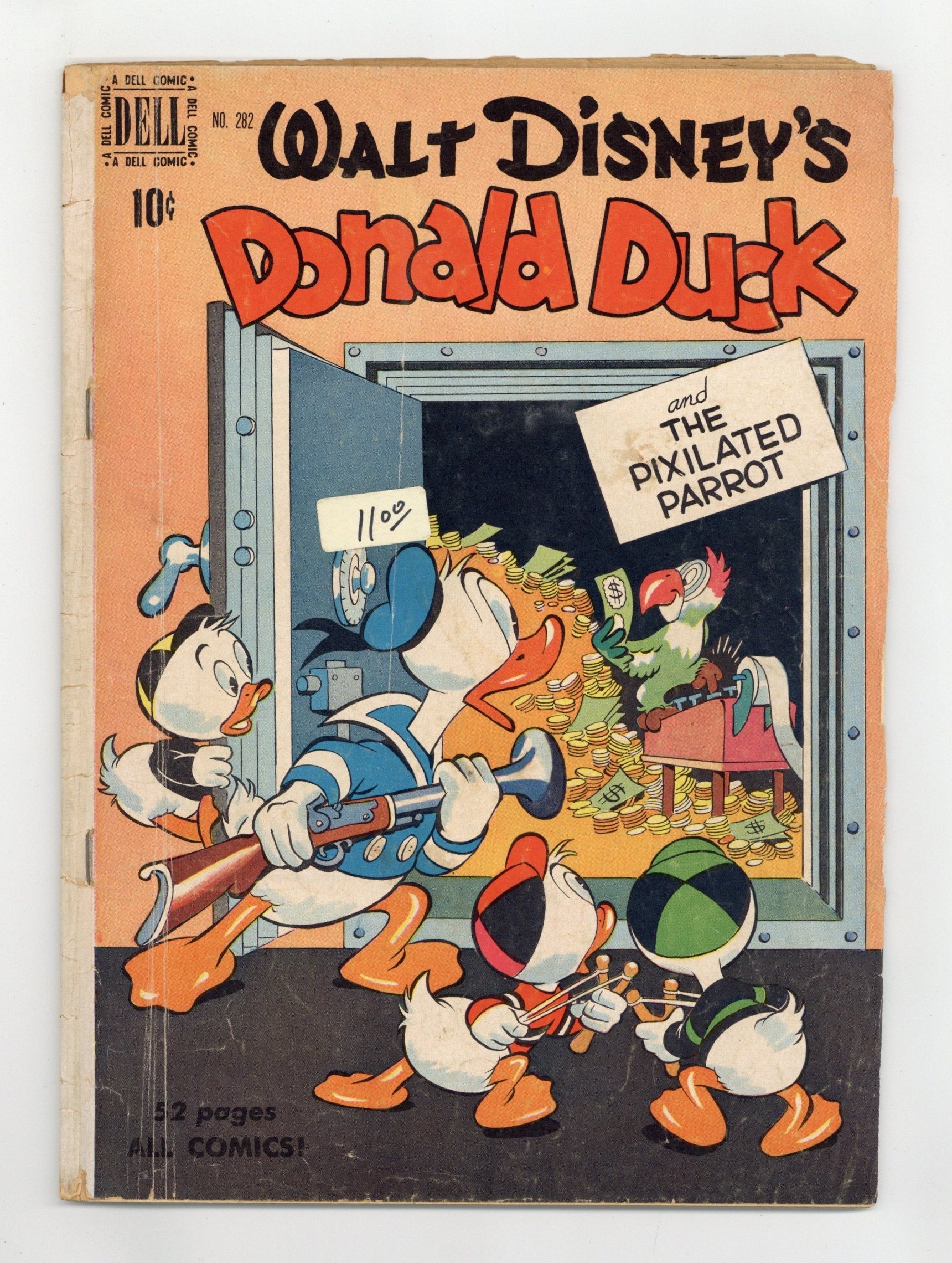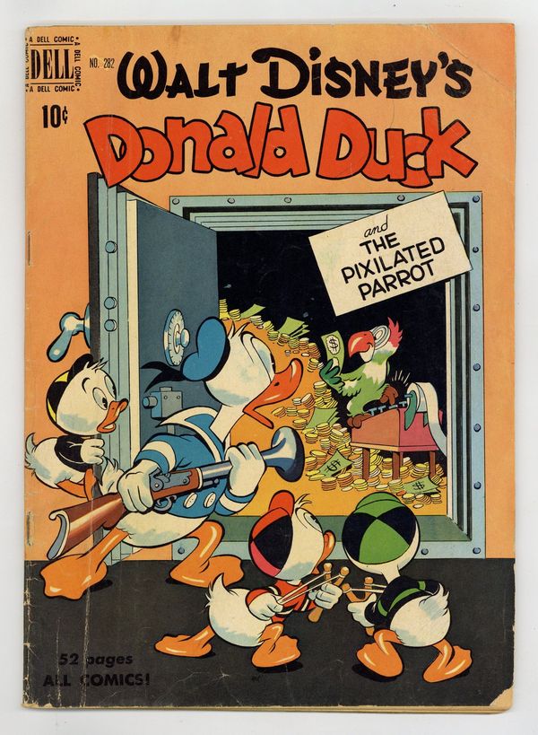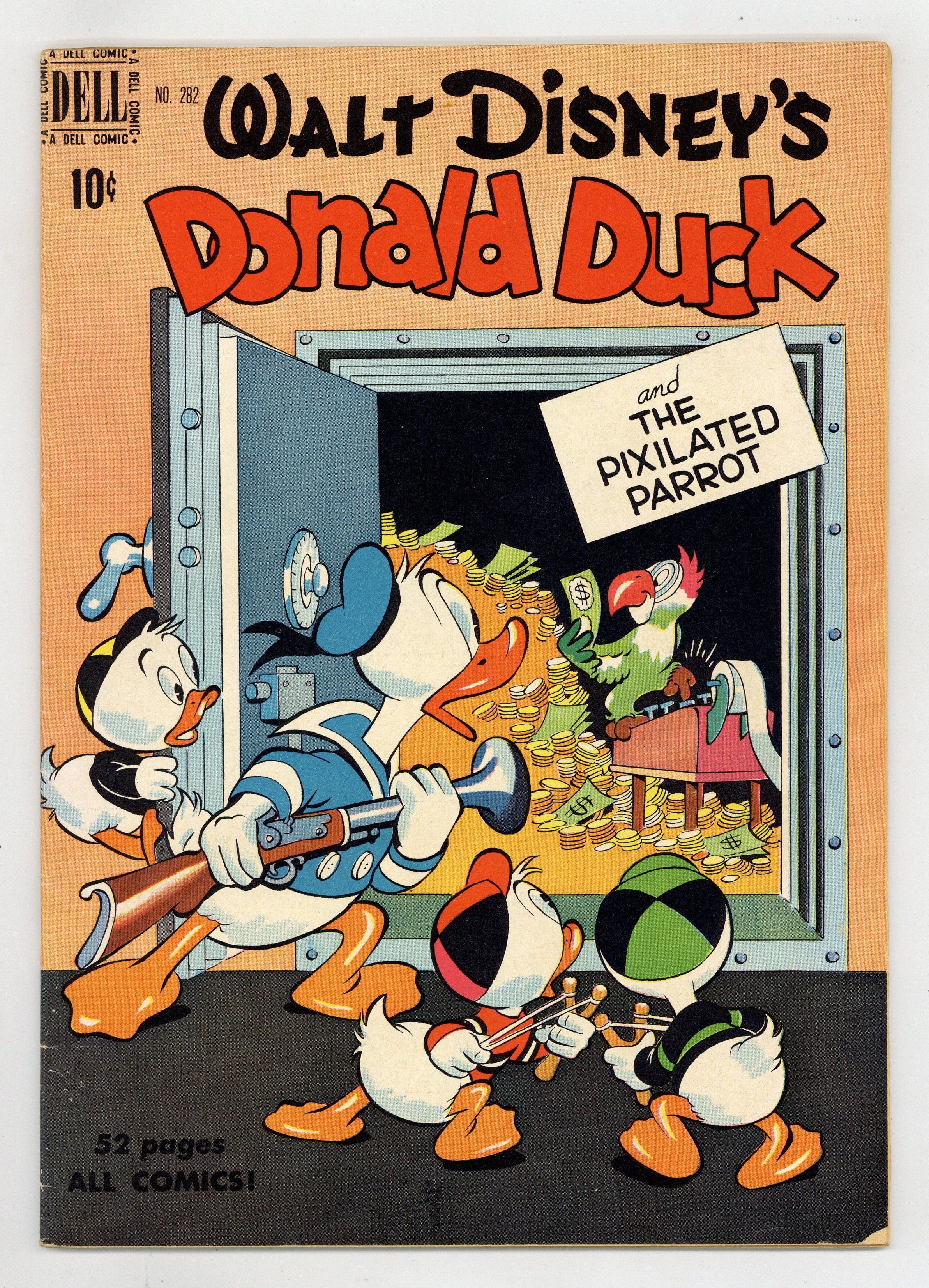 Indicia title is "Walt Disney's DONALD DUCK and the PIXILATED PARROT, No. 282." Cover art by Carl Barks. Donald Duck and "The Pixilated Parrot, script and art by Carl Barks; Donald gives Uncle Scrooge a parrot that only counts, instead of talking, and Scrooge has the parrot memorize the combination to his safe; which Scrooge has been forgetting. Pig in a Poke, pencils by Riley Thompson; Huey, Dewey, and Louis go to a farm to get an animal to show at the county fair. Fresh Milk and Eggs, art by Paul Murry; Donald is a milkman whose customers complain about not receiving fresh milk and eggs. 52 pages, full color. Cover price $0.10.