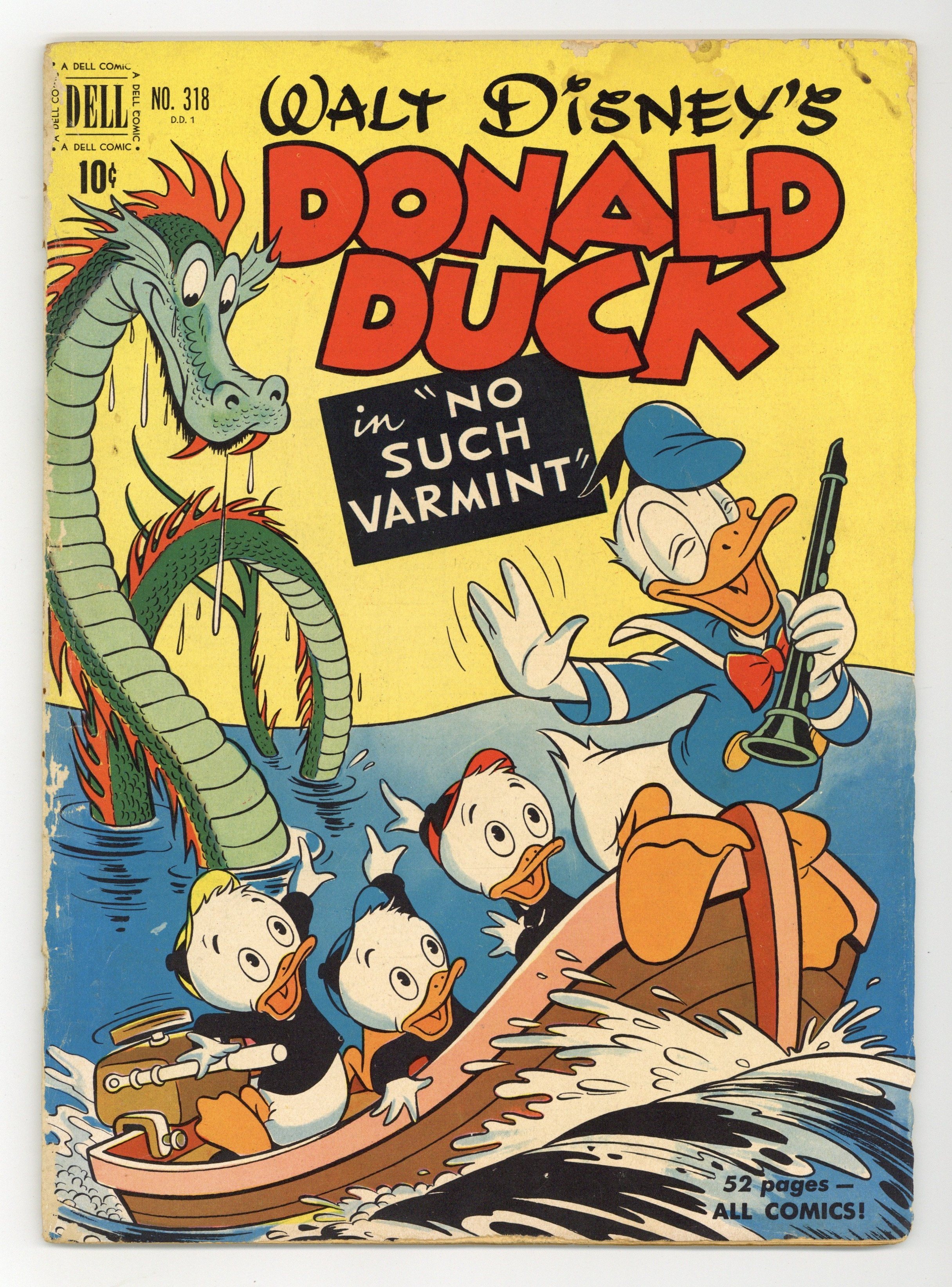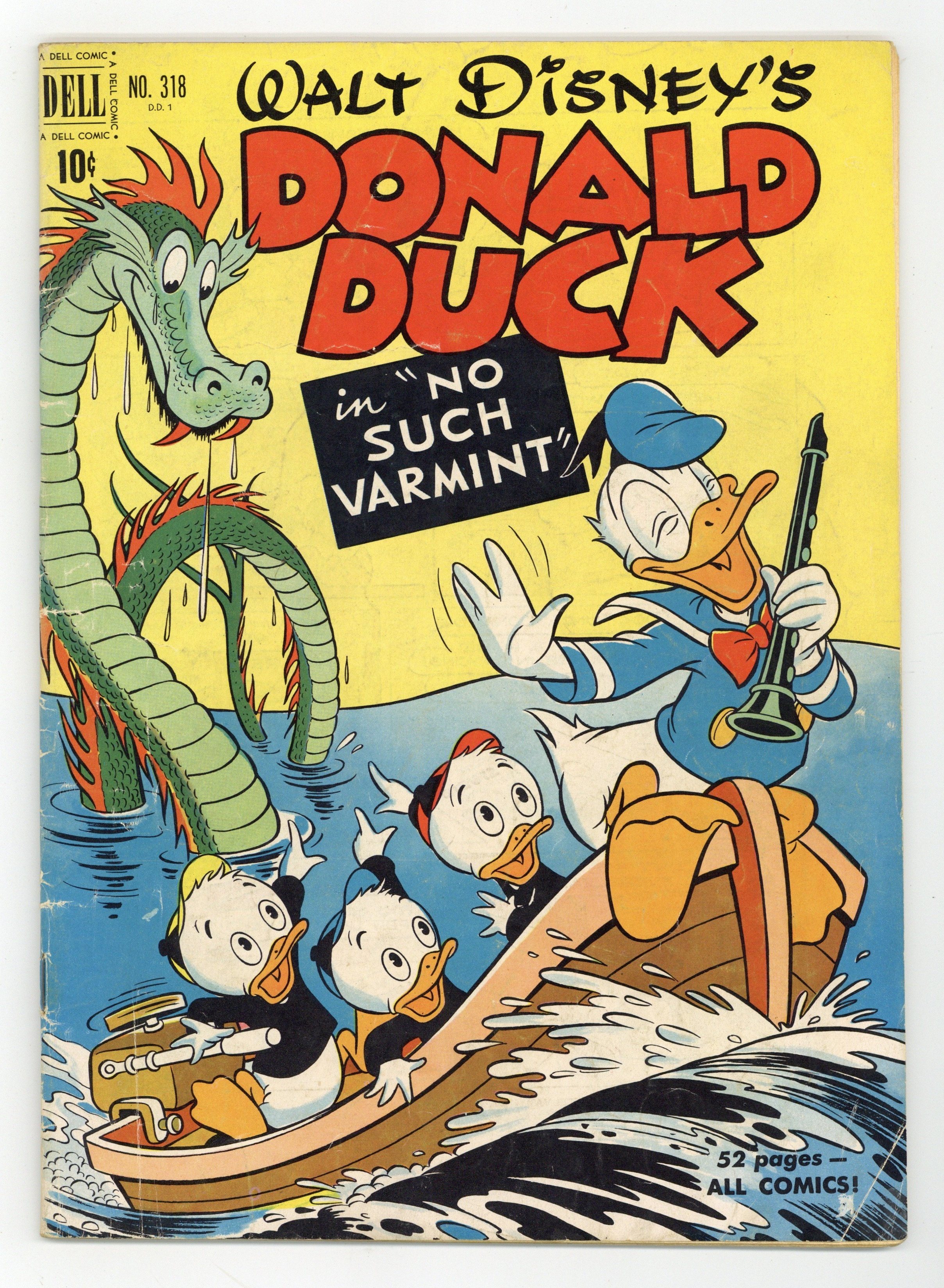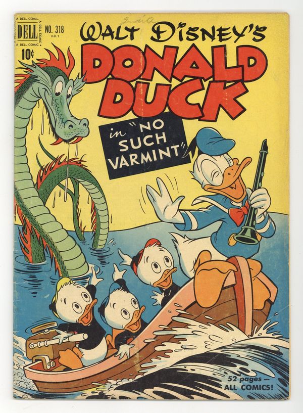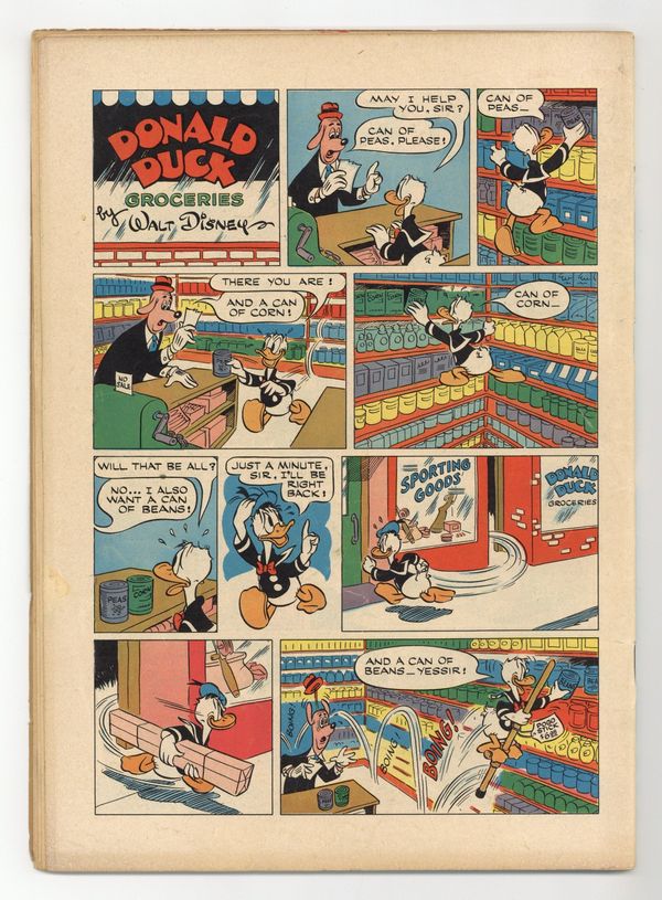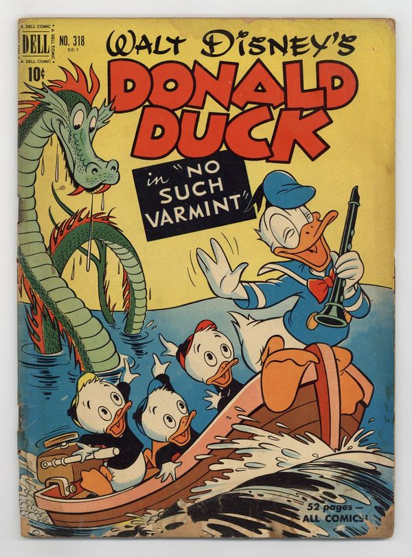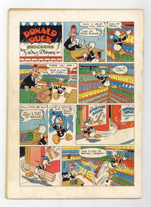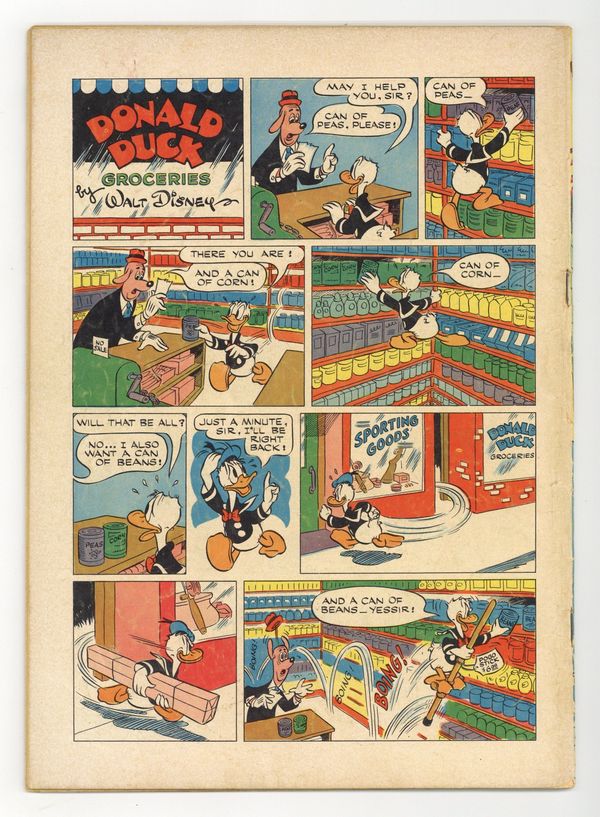 No Such Varmint, script and art by Carl Barks; An aptitude test says that Donald should be a great detective, and so he is hired to investigate the mysterious sinking of one of Uncle Scrooge's gold ships; Donald's true aptitude is that of a snake charmer, though, and his playing so charms a huge sea serpent that he has to keep playing for days. Stalwart Stowaways, art by Frank McSavage. Back cover strip starring Donald Duck, art by Paul Murry. 52 pages, full color. Cover price $0.10.
