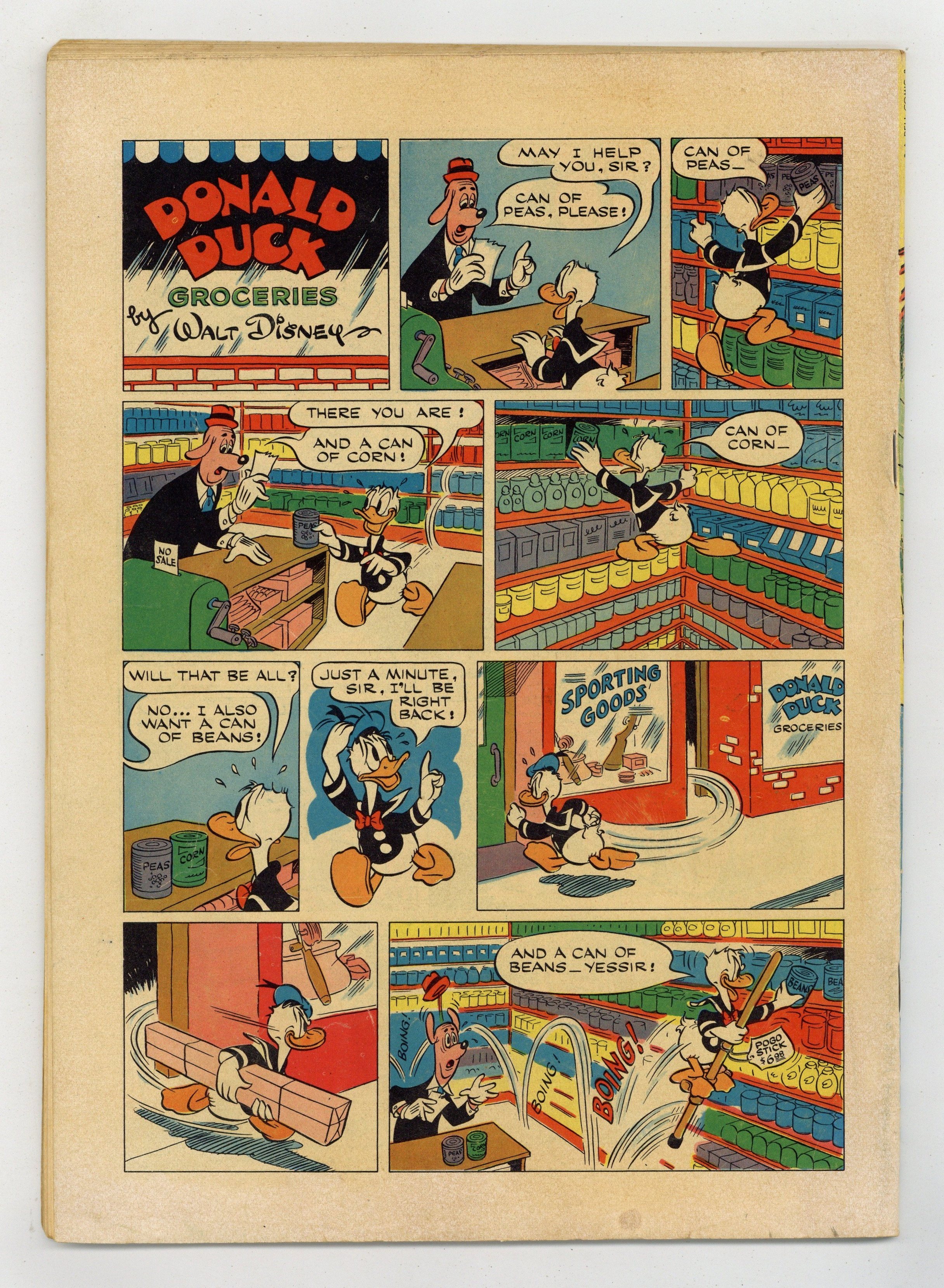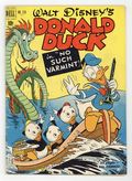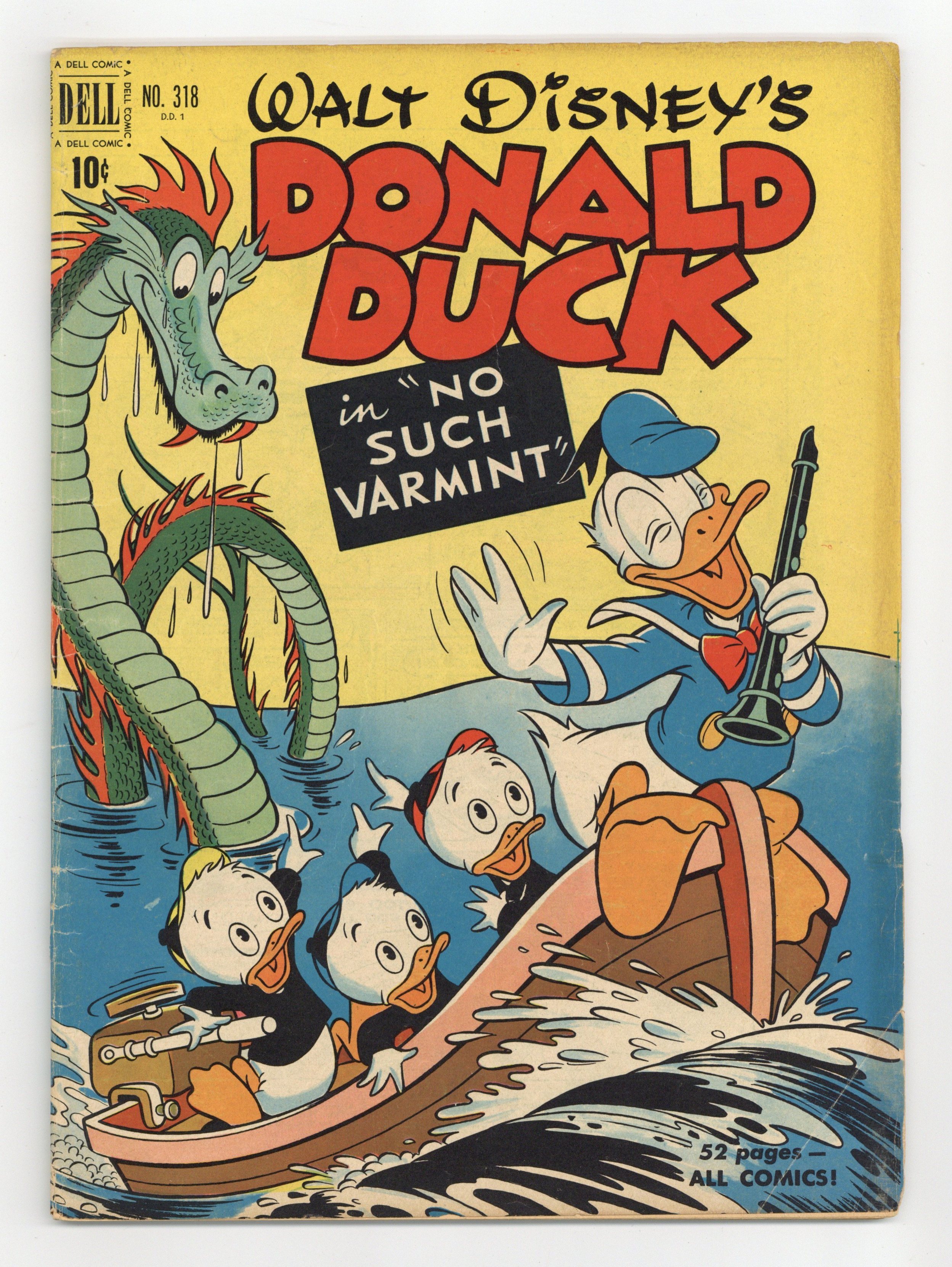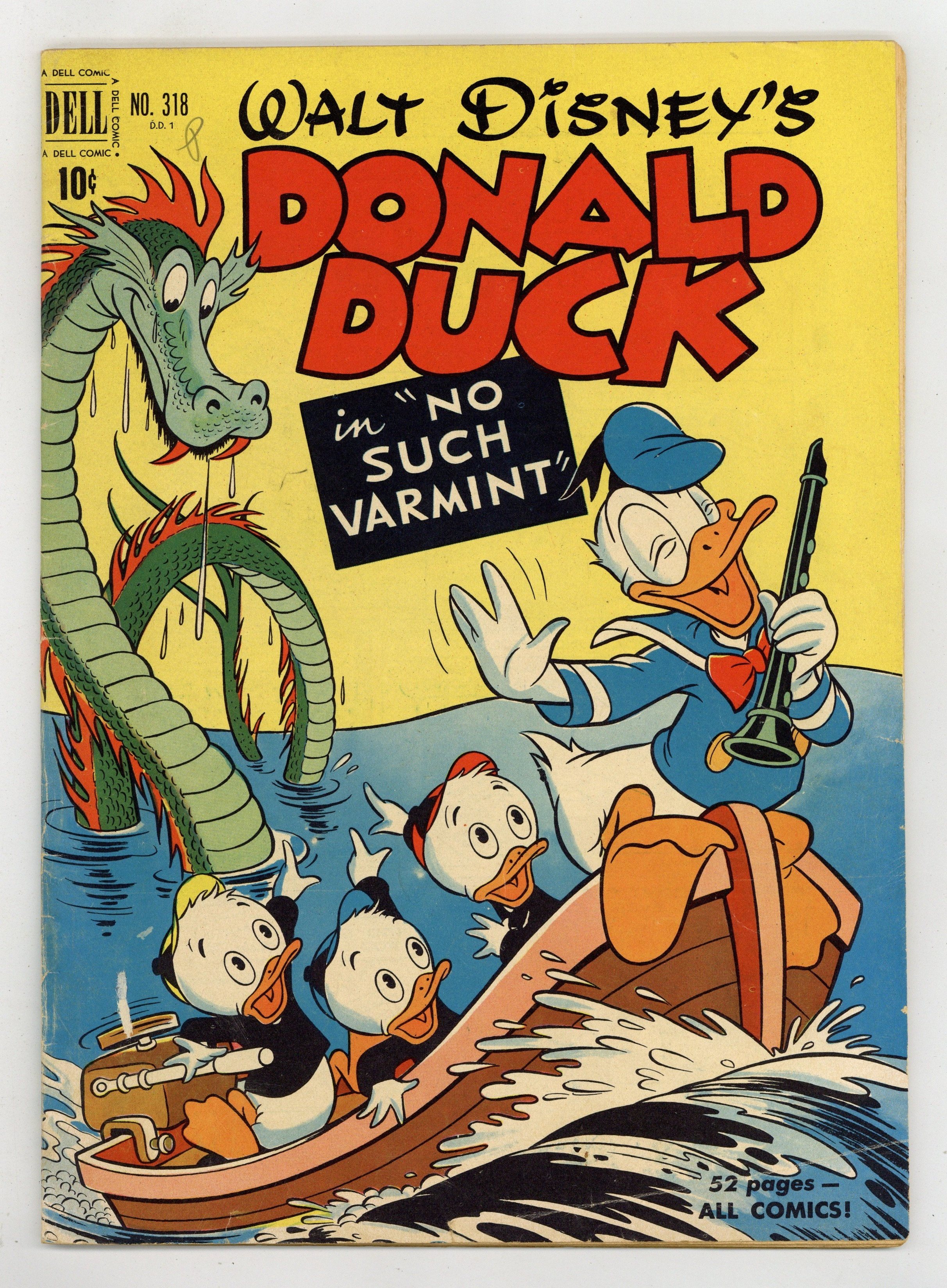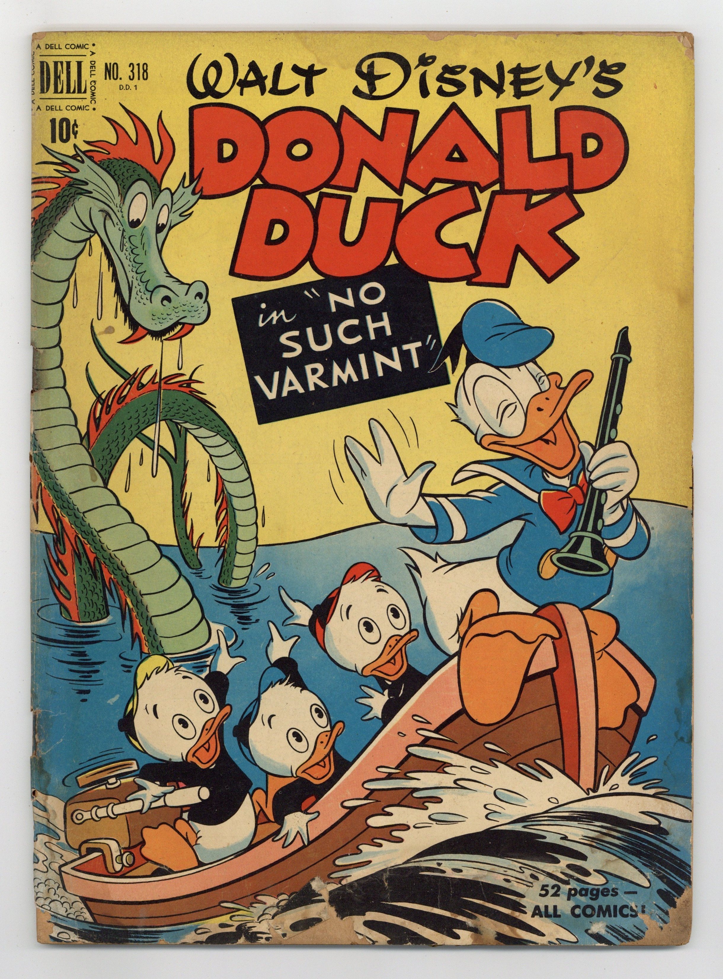 No Such Varmint, script and art by Carl Barks; An aptitude test says that Donald should be a great detective, and so he is hired to investigate the mysterious sinking of one of Uncle Scrooge's gold ships; Donald's true aptitude is that of a snake charmer, though, and his playing so charms a huge sea serpent that he has to keep playing for days. Stalwart Stowaways, art by Frank McSavage. Back cover strip starring Donald Duck, art by Paul Murry. 52 pages, full color. Cover price $0.10.