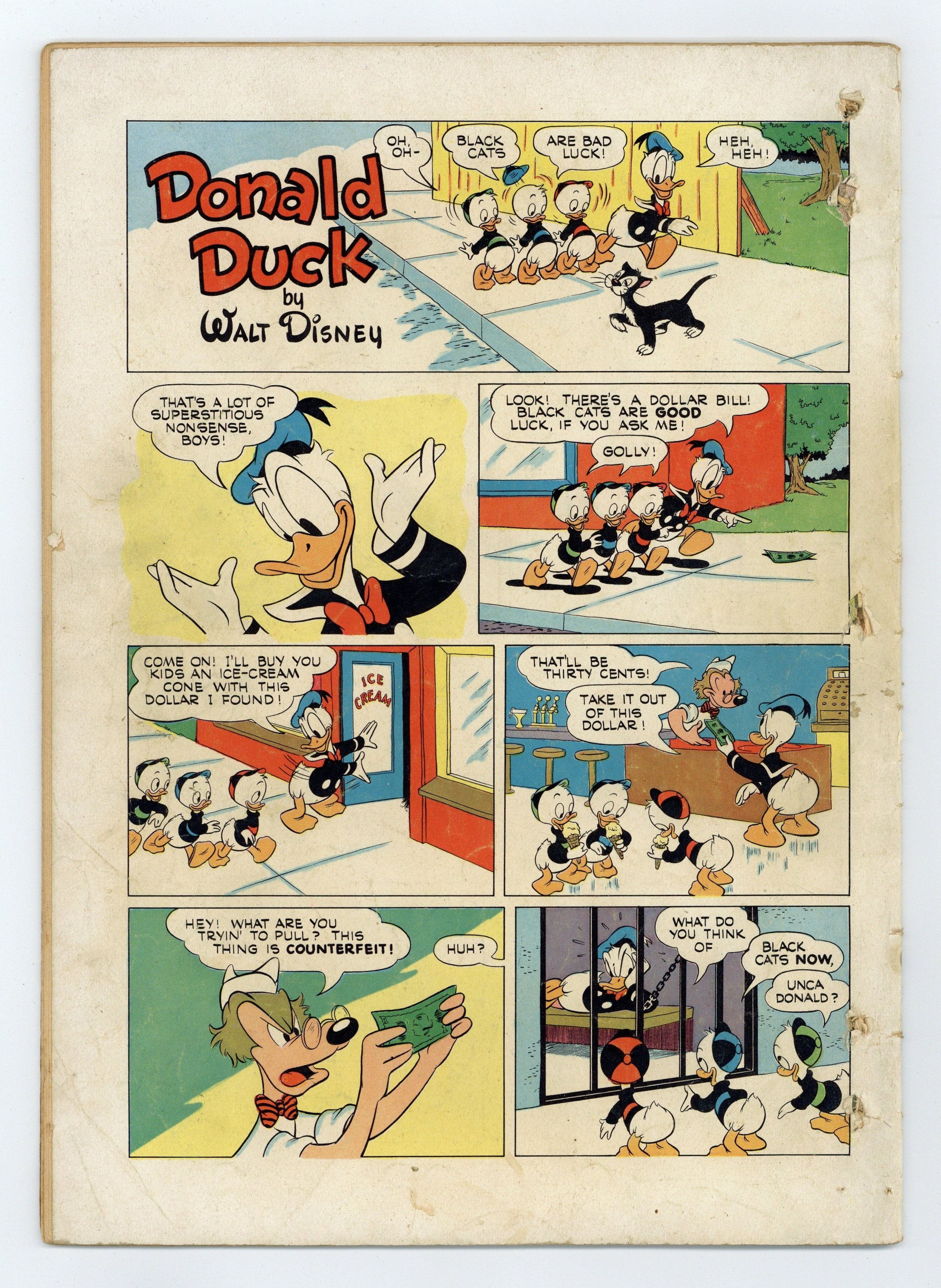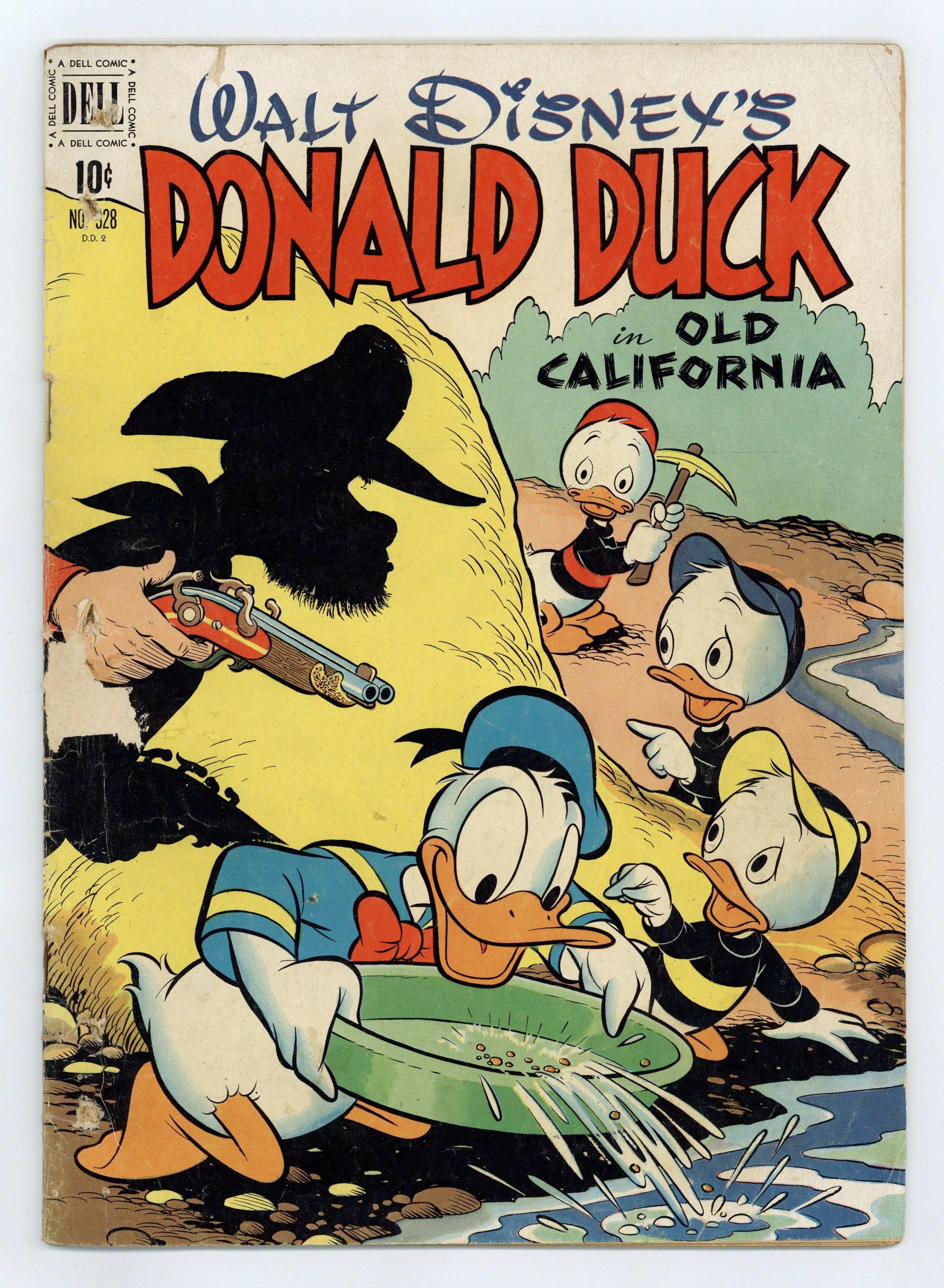 Cover art by Carl Buettner. Donald Duck in Old California!, script and art by Carl Barks; The ducks, injured in a car wreck in Southern California, are transported by means of a mysterious dream to the California of 1848; While there they stay at the home of a wealthy Spanish rancher, take part in the gold rush, and help a young vaquero win the hand of a rancher's daughter. Grandma's Visit starring Donald Duck, script by Don Christensen, art by Bob Moore. 36 pages, full color. Cover price $0.10.