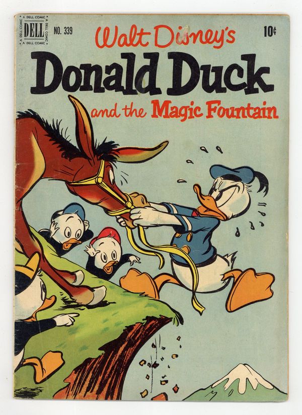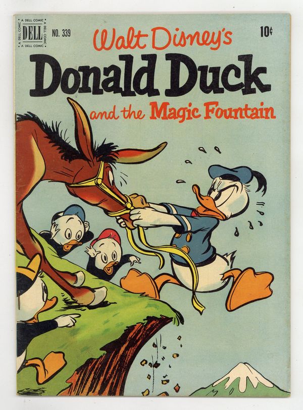 $14.00The Magic Fountain, script by Del Connell, art by Bob Moore; Uncle Scrooge sends Donald and his nephews to the mountain country of Arainia to bring back some water from their fountains of youth. The Wonders of Nature, art by Bob Moore; A woodpecker interrupts Donald's lecture to his nephews on the wonders of nature. Give-and-Take, art by Bob Moore; Donald tries to get some sleep, but his nephews keep disturbing him while playing with a variety of toy guns. 36 pages, full color. Cover price $0.10.