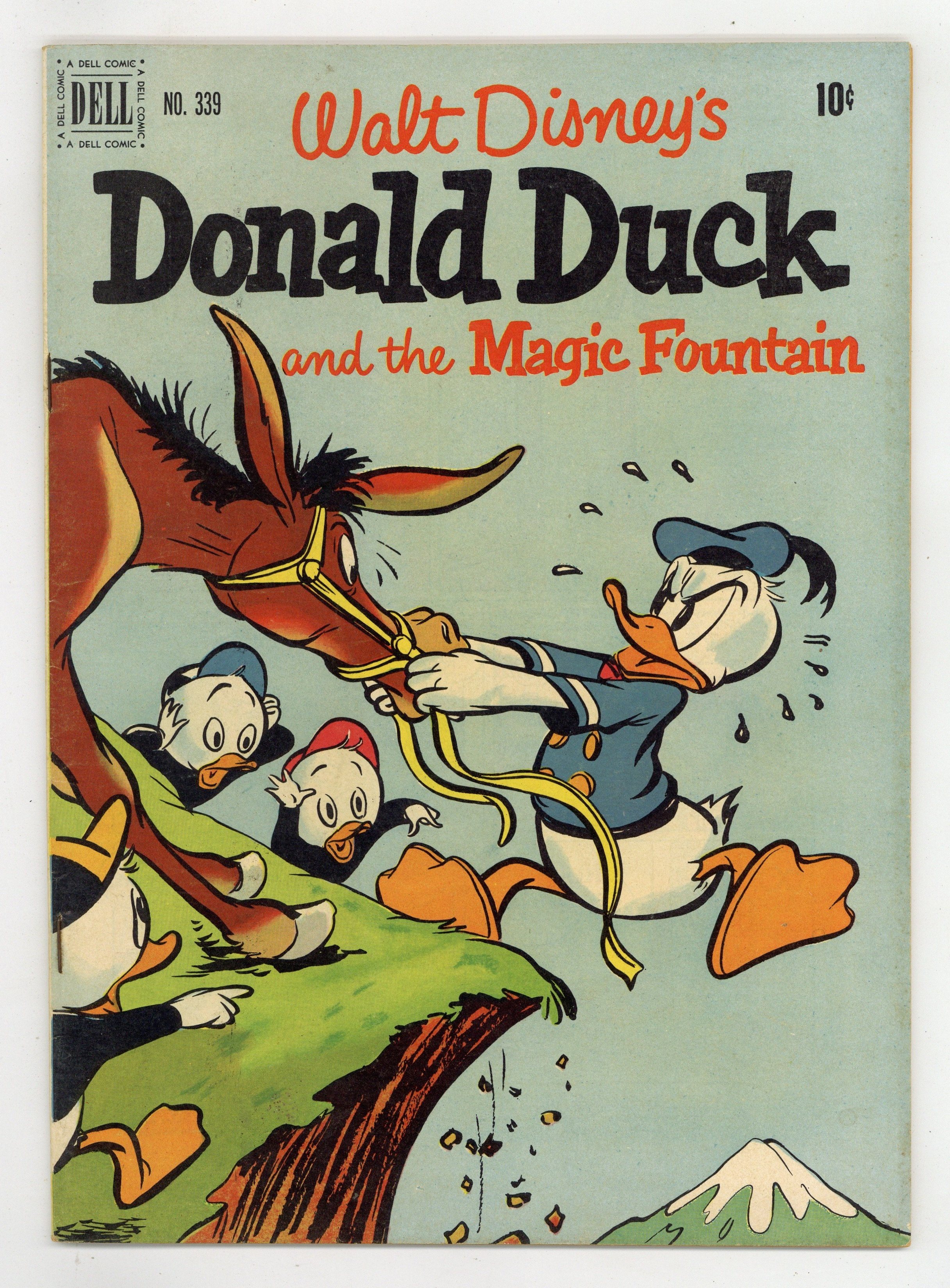 The Magic Fountain, script by Del Connell, art by Bob Moore; Uncle Scrooge sends Donald and his nephews to the mountain country of Arainia to bring back some water from their fountains of youth. The Wonders of Nature, art by Bob Moore; A woodpecker interrupts Donald's lecture to his nephews on the wonders of nature. Give-and-Take, art by Bob Moore; Donald tries to get some sleep, but his nephews keep disturbing him while playing with a variety of toy guns. 36 pages, full color. Cover price $0.10.