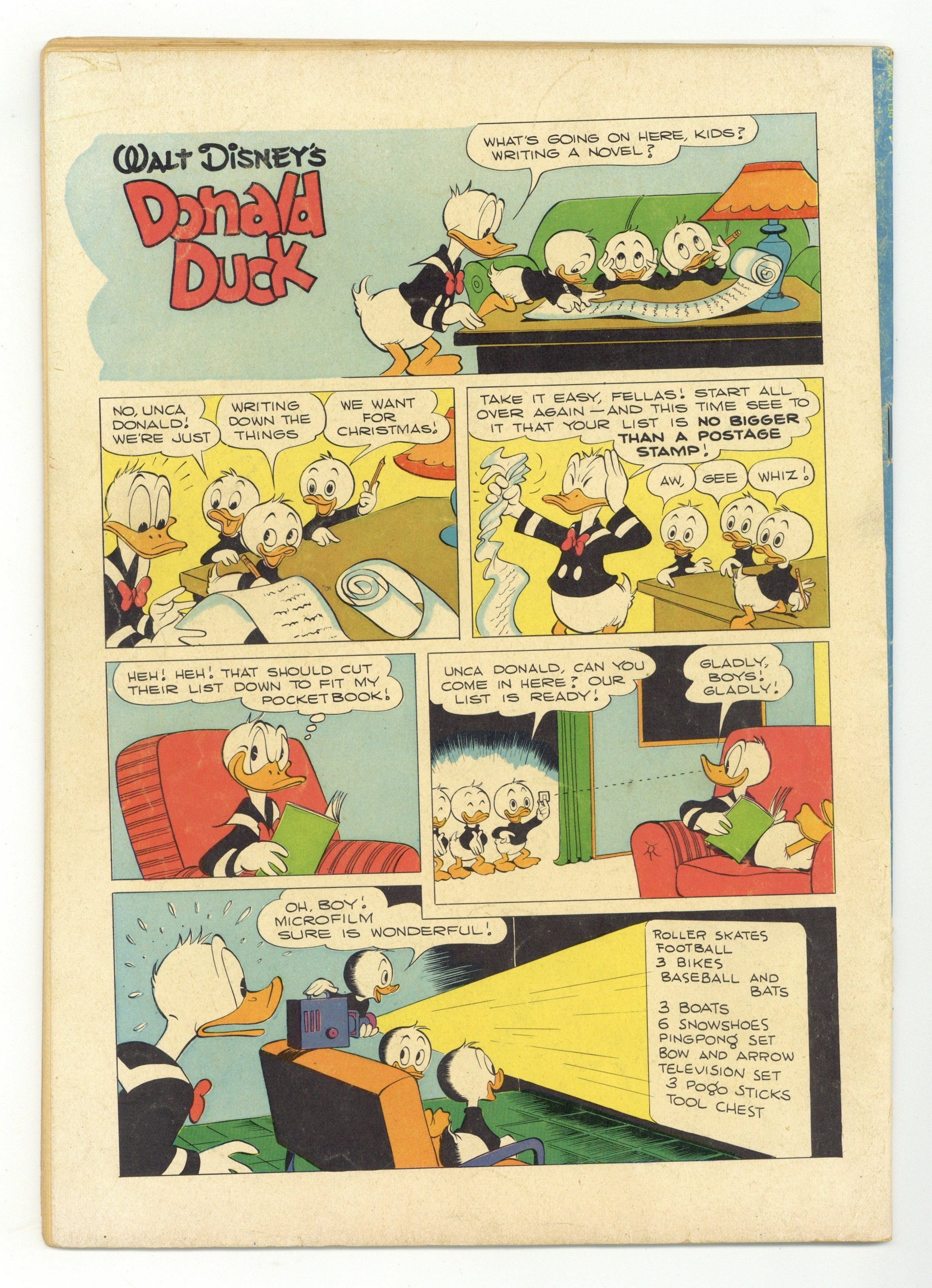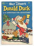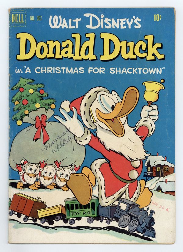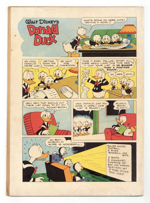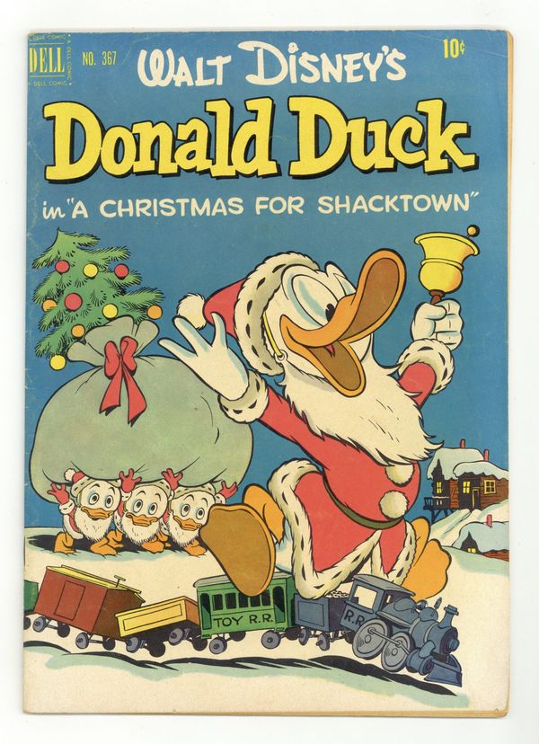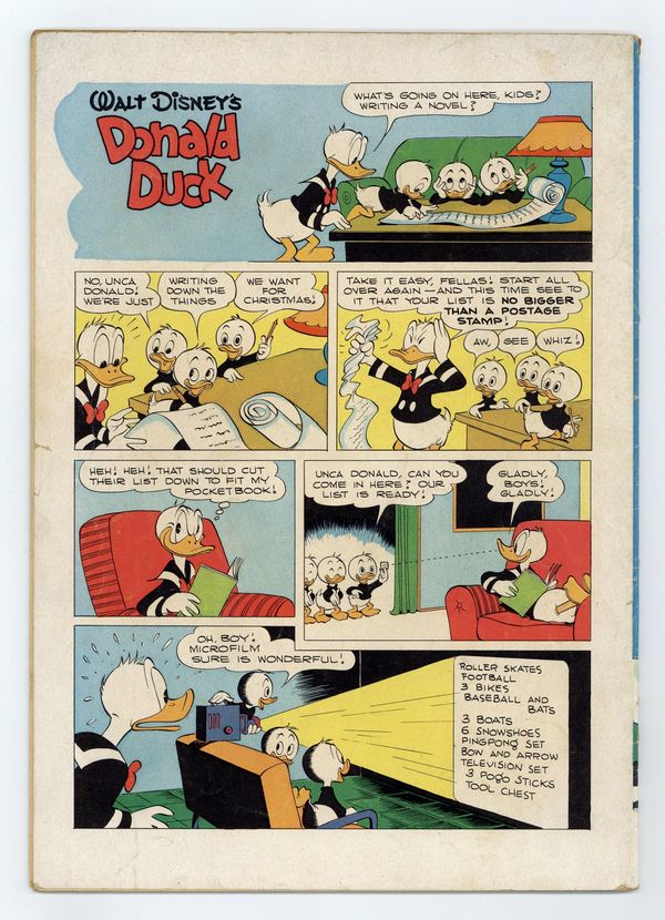 Cover art by Carl Barks. A Christmas for Shacktown, script and art by Carl Barks; The ducks and Daisy get Scrooge's promise to match their twenty-five dollars for Christmas dinner and a toy train for the poor children of Shacktown; Scrooge is unable to deliver when the floor of his money bin collapses and his money falls deep into an unknown cavern, separated by only a thin crust from bottomless quicksand. Christmas Kiss, art by Carl Barks; Donald brings his own mistletoe to win a kiss from Daisy. Back cover strip with art by Barks. 36 pages, full color. Cover price $0.10.