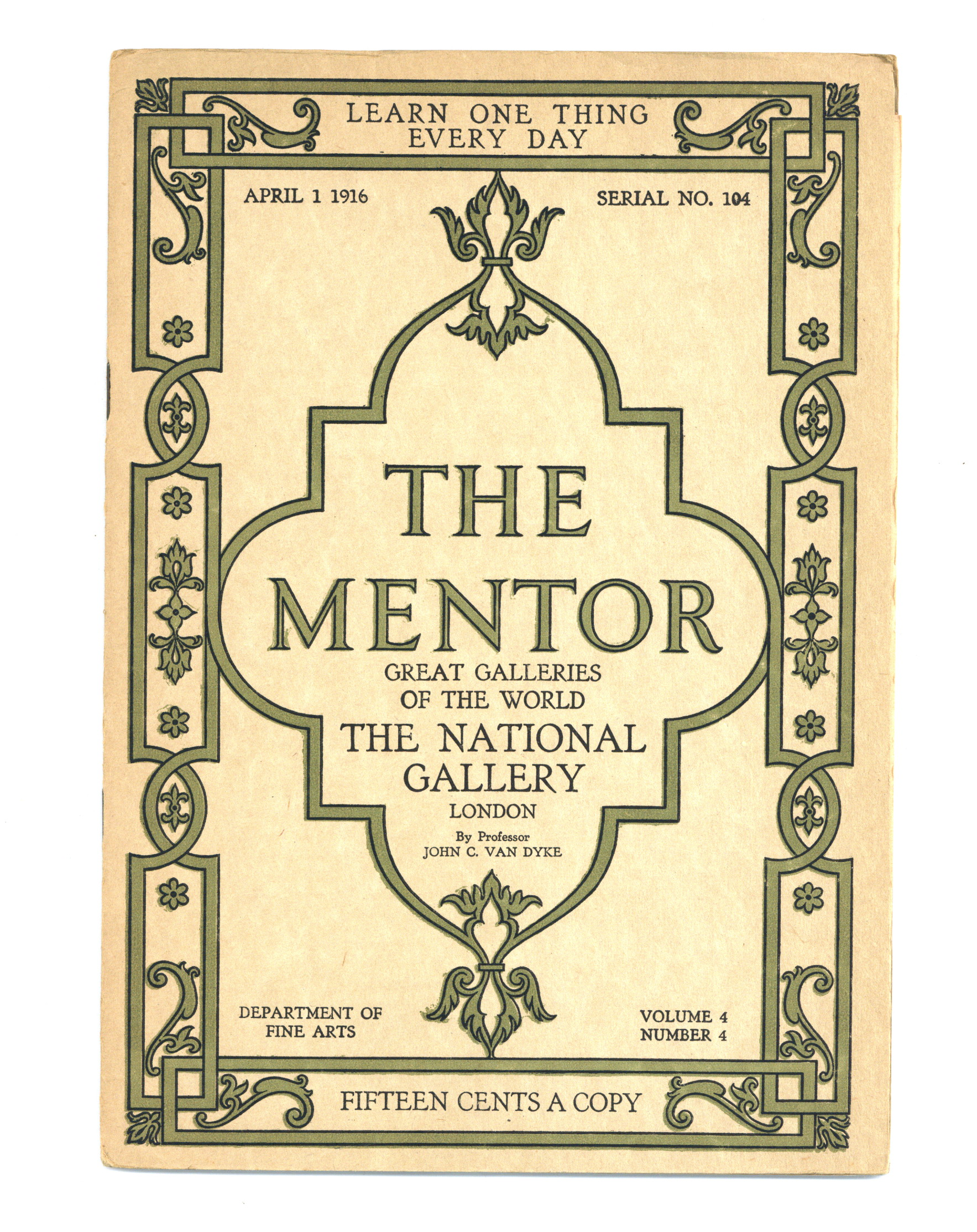 Published Apr 1916 by Mentor Association.$69.00Volume 4, Issue 4 (Whole Number 104) - April 1, 1916. Department of Fine Arts. In this issue: "Great Galleries of the World: The National Gallery, London" by Professor John C. Van Dyke. 7-in. x 10-in.; black and white; 12 pages on white paper plus card-stock covers. Cover price $0.15.