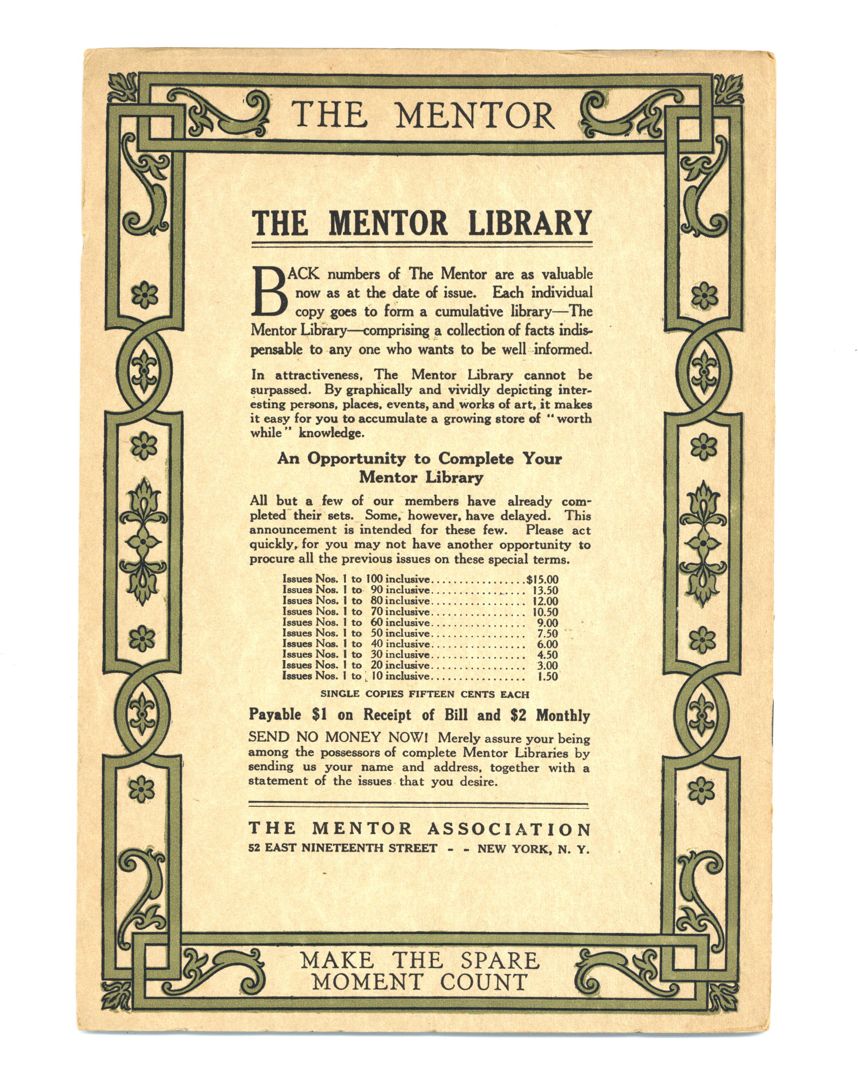 Published Apr 1916 by Mentor Association.$2.50- Spine split 90%. Cover Detached. Staple rust: Moderate.