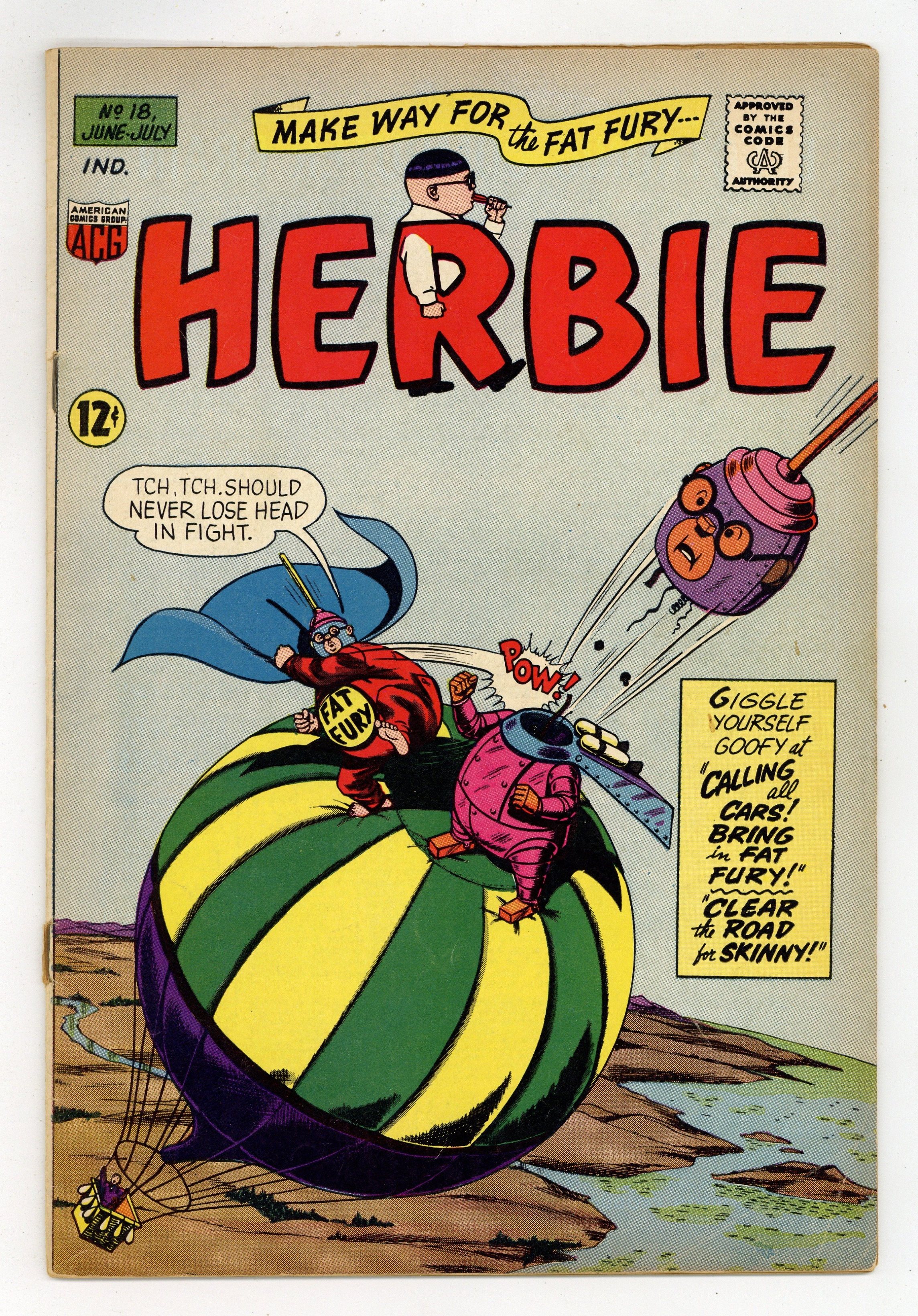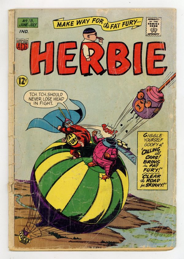 Cover art by Kurt Schaffenberger. Calling All Cars! Bring in Fat Fury!, script by Richard Hughes (as Shane O'Shea), art by Ogden Whitney; Question Mark uses machines for every type of crime, but the Fat Fury foils his efforts. After 10,416 curses, Question Mark uses his Locate Things Machine to find the Fat Fury and his Source of His Powers Machine to discover that his Destroying All Lollipops machine will disable his adversary. Then Question Mark unleashes a Fat Fury (Phony Phat Phury) robot that everyone mistakes for our hero. Clear the Road for Skinny!, script by Richard Hughes (as Shane O'Shea), art by Ogden Whitney; Herbie's father feels like a failure because he can't get Herbie to lose weight. Herbie enlists the help of President Johnson and Vice President Humphrey who call his father to Washington. Herbie's father can't understand why everyone seems to know Herbie: Governor Nelson Rockefeller, President Charles de Gaulle, and Queen Elizabeth. 32 pgs. $0.12. Cover price $0.12.