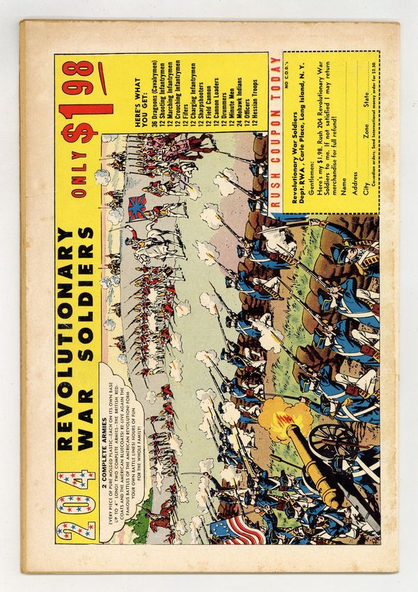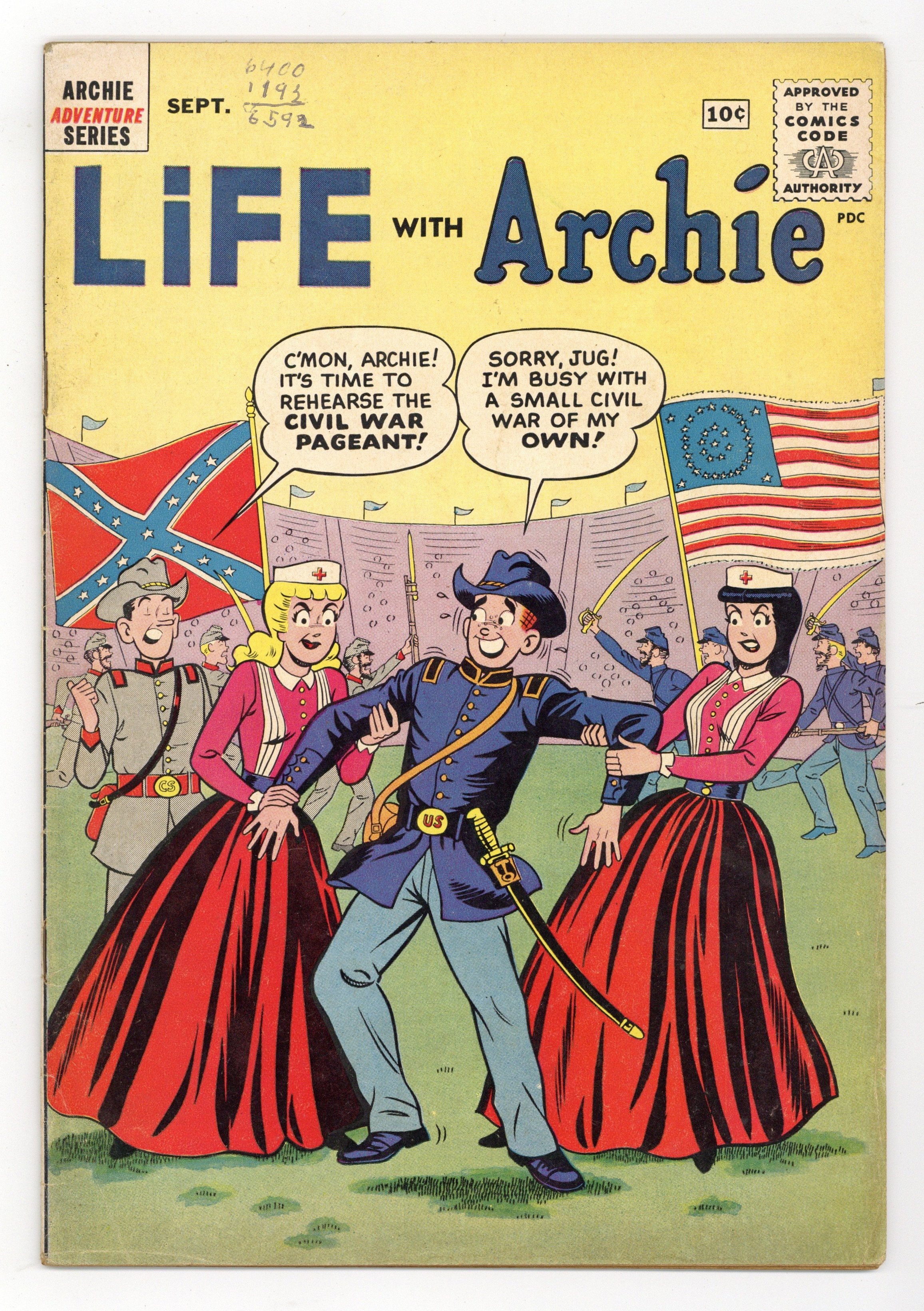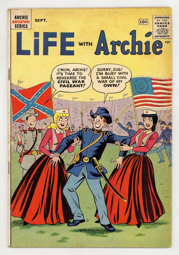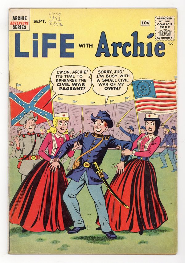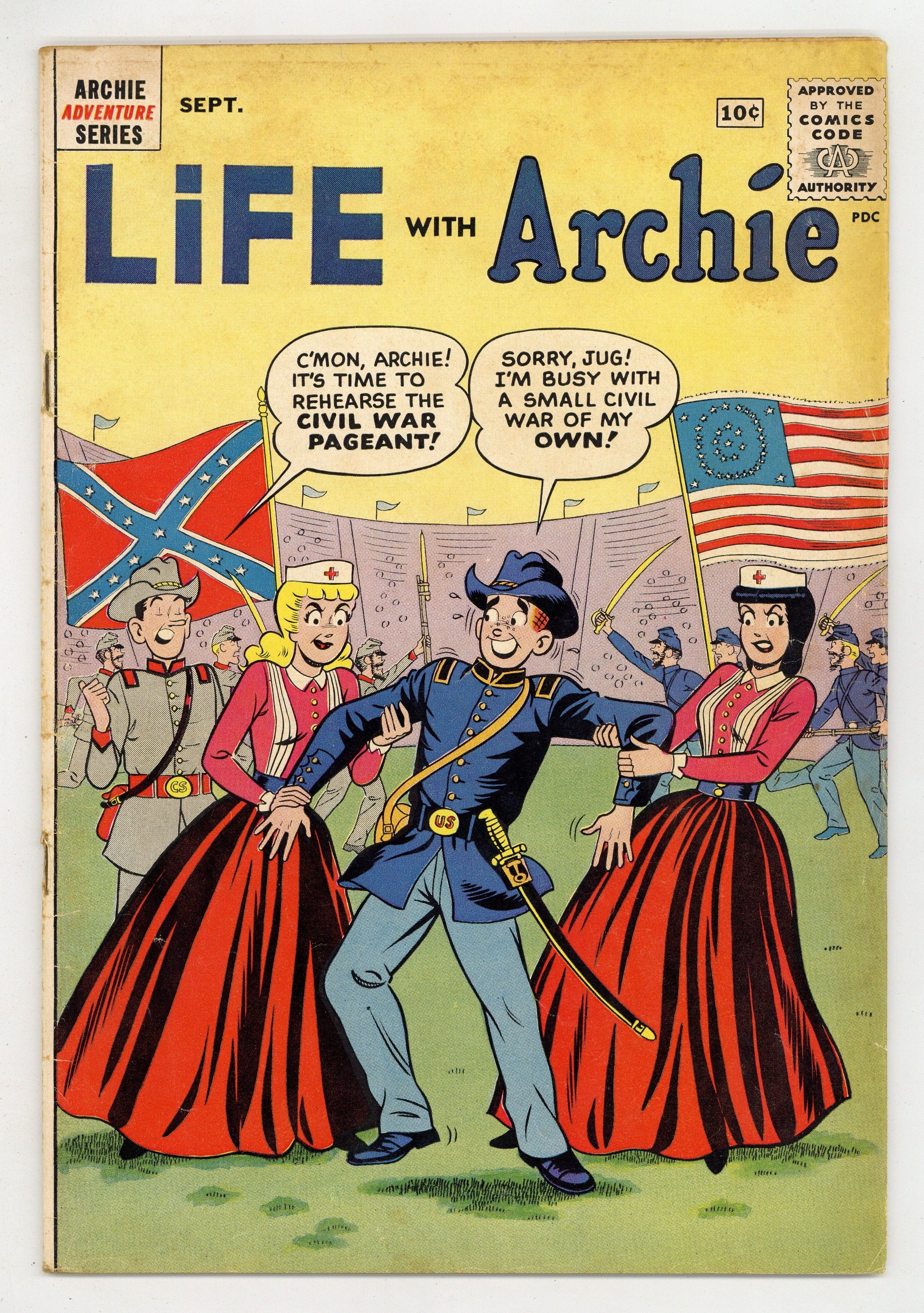 Content warning: Confederate imagery. Cover art by Bob White. Book-length story told in four chapters: "Historically Hysterical," "Come Out Fighting," "The Big Crisis," and "Archie Saves the Show, script by Sy Reit, pencils by Bob White, inks by Marty Epp; Riverdale High puts together a big pageant for the 100th anniversary of the Civil War; As a prank, Reggie decides to sabotage the pageant by swiping the costumes. Miracles of Nature text article, art by Ken Hultgren. Much Better! one-pager by Li'l Jinx, script and art by Joe Edwards. 36 pgs. $0.10. Cover price $0.10.