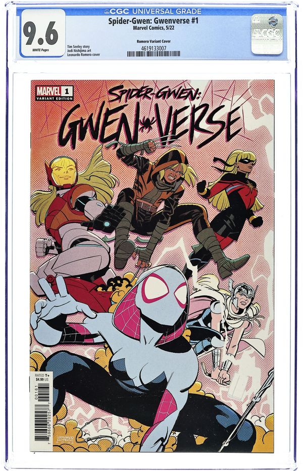 Limited 1 for 25 Retailer Incentive Variant Cover. Written by Tim Seeley. Art by Jodi Nishijima. Cover by Leonardo Romero. NOT ENOUGH GWENS! When Gwen Stacy was bitten by a radioactive spider, she gained arachnid-like super-powers and started a crimefighting career as Spider-Woman (or as she's affectionately known to her peers, Ghost-Spider)! But what would have happened if instead she had picked up the enchanted hammer, Mjolnir? Or if she received the Super-Soldier Serum? Or built a high-tech suit of armor? Or…you get the idea! Find out in this new five-issue miniseries by Tim Seeley (HEROES REBORN: MARVEL DOUBLE ACTION) and Jodi Nishijima (UNITED STATES OF CAPTAIN AMERICA) as Ghost-Spider tumbles through time and comes face-to-face with herselves! 36 pages, full color. Rated T+ Cover price $4.99.