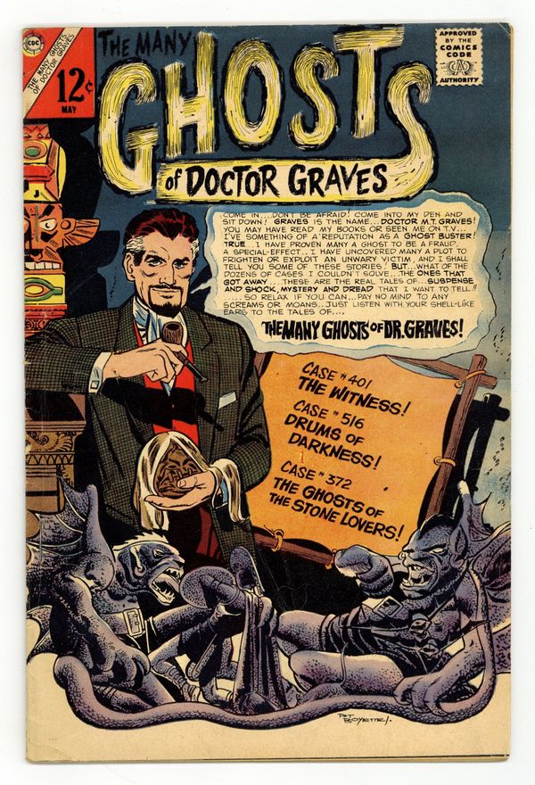 Come in...don't be afraid! Come into my den and sit down! Graves is the name...Doctor M.T. Graves! You may have read my books or seen me on TV...I've something of a reputation as a ghost buster! True...I have proven many a ghost to be a fraud, a special effect...I have uncovered many a plot to frighten or exploit an unwary victim, and I shall tell you some of these stories! But...what of the dozens of cases I couldn't solve...the ones that got away...these are the real tales of...suspense and shock, mystery and dread that I want to tell! So relax if you can...pay no mind to any screams or moans...just listen with your shell-like ears to the tales of...The Many Ghosts of Doctor Graves! Featuring: 1 page contents page drawn by Rocke Mastroserio; 8 page Dr. Graves story "The Witness! [Case: 401]" drawn by Bill Ely; 4 page Dr. Graves story "Drums of Darkness [Case: 516]" drawn by Pat Boyette; 1 page text story "Rethcal"; 2 page story "Mirror, Mirror on the Wall" drawn by Rudi Palais; 2 page Mr. Dedd story "Ghostly Tales from the Haunted House" drawn by Rudi Palais; 8 page Dr. Graves story "The Ghosts of the Stone Lovers [Case: 372]" drawn by Steve Ditko and Pat Boyette. Cover by Pat Boyette. Cover price $0.12.