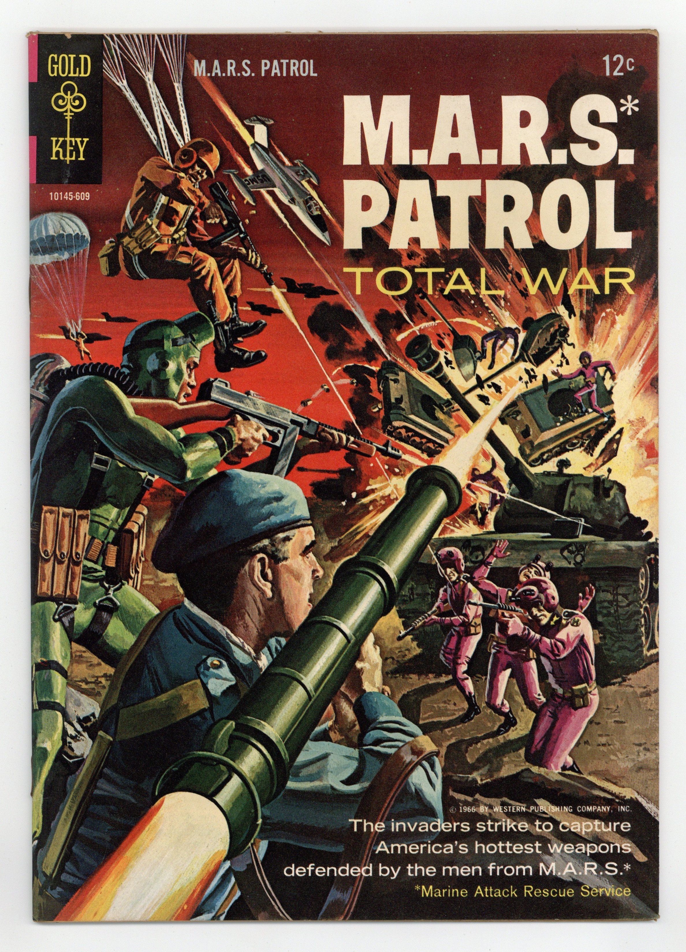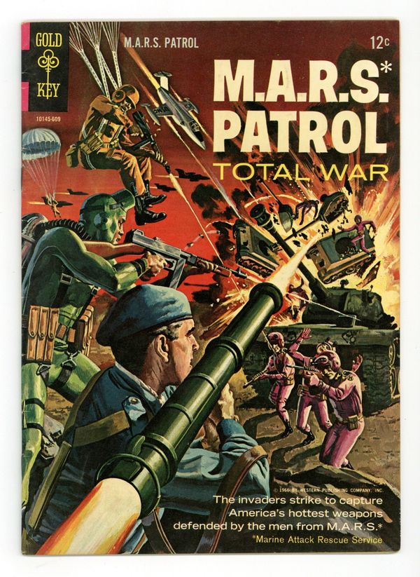 Comic is titled "M.A.R.S. Patrol Total War" with this issue. Painted cover art by George Wilson. "Survival for Soldiers" one-page fact story, art by Joe Certa. "Operation Copperhead," script by Leo Dorfman, art by Wally Wood; Acting as individuals the M.A.R.S. men take the lead in foiling the invaders' thefts of a navy atomic submarine, advanced technology equipment, a laser-armed super-tank, and an experimental VTOL jet. M.A.R.S. Patrol Pin-Up on back cover, painted by George Wilson. # on cover 10145-609 (no month listed). 36 pgs., full color. Cover price $0.12.