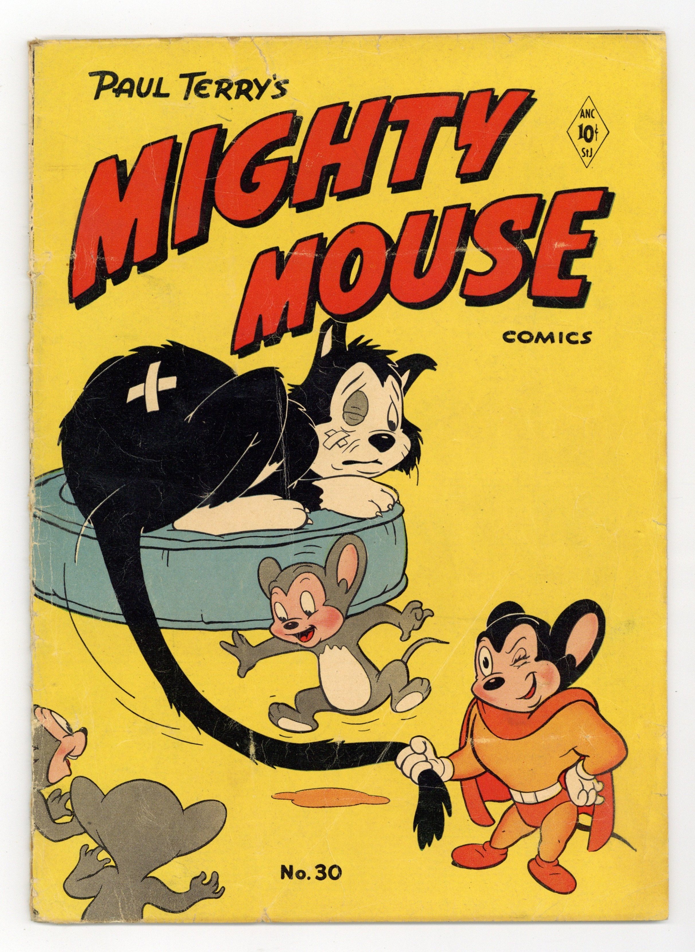 Art by Jim Tyer and others. The world's mightiest mouse defends Mouseville from danger - mostly cats - in the comic-book adventures of the Terrytoons animated superhero. A naive young rabbit needs constant rescuing by Mighty Mouse. Oil Can Harry's latest invention, the thinking cap, gives him the genius to transport Pearl Pureheart to Jupiter. The obese feline known as Fatty uses his mind to catch mice, but Mighty Mouse is no slacker in that department either. Dinky; Gandy Goose; The Reluctant Rescue; The Perils of Pearl Pureheart; Fatty's Folly; The Grateful Kitten; Little Roquefort; Heckle and Jeckle: The Tall Story Club. 32 pages, Full Color. Cover price $0.10.