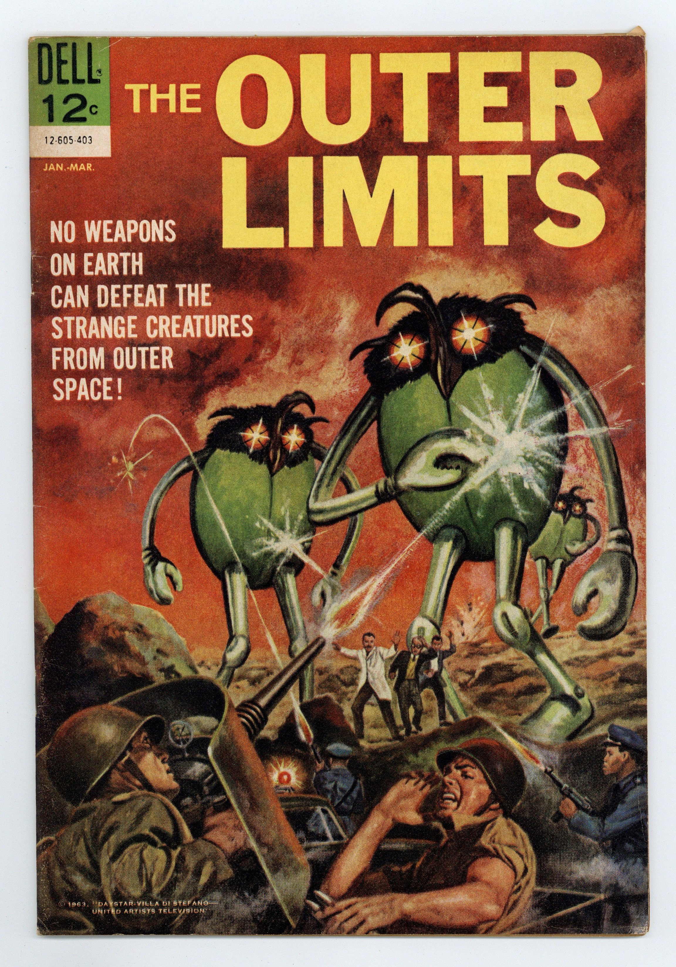 Painted cover by Vic Prezio. Stories by Paul S. Newman. Art by Jack Sparling. Cover number is 12-505-403. Battleground of Monsters. Like the Twilight Zone, but more science fiction than fantasy, The Outer Limits chilled 1950s TV audiences with tales of what-if featuring twist endings. A century's worth of missing-persons reports are explained when aliens arrive on Earth to suggest a sort of cosmic prisoner exchange. But although the first aliens are benevolent, the ones that come after them... are not. 32 pages, Full Color. Cover price $0.12.