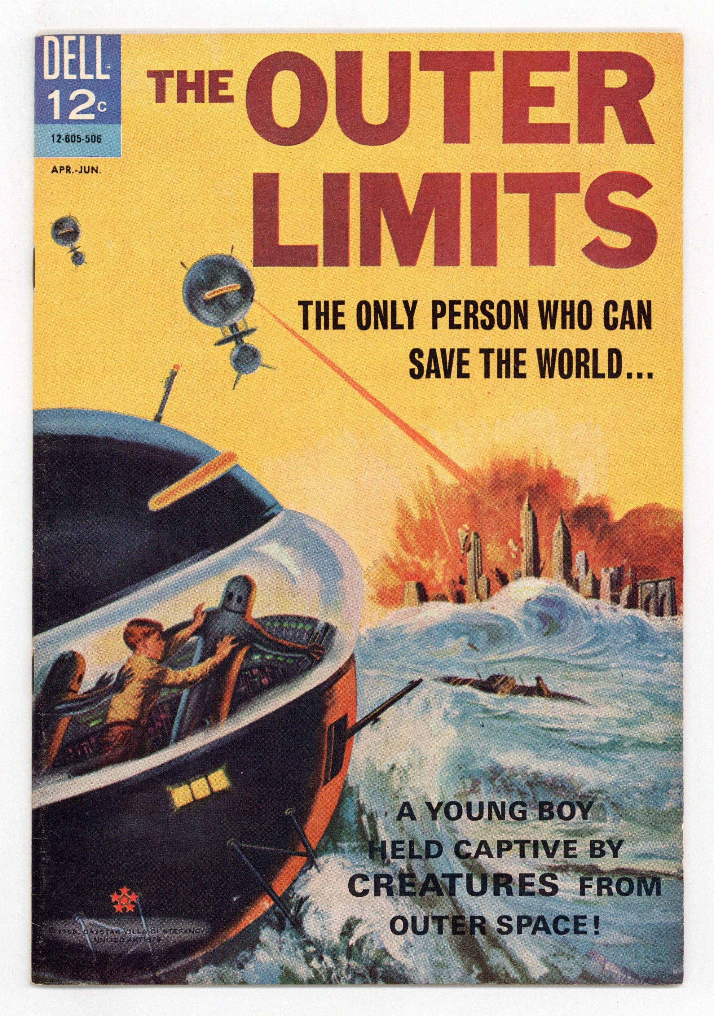 Painted cover by Jack Faragasso. Art by Jack Sparling. Cover number is 12-605-506. Like the Twilight Zone, but more science fiction than fantasy, The Outer Limits chilled 1950s TV audiences with tales of what-if featuring twist endings. Young Jim knows about the aliens, but they have him in a trance. The weird aliens, who look like living pencil erasers, use their mind-manipulation of Jim as they arrange weather and environmental disasters to doom Earth. But they're vulnerable to cold, a fact Jim remembers as he awakens from his trance. The Mystery Moon; When Disasters Strike; The Aliens Attack. 32 pages, Full Color. Cover price $0.12.