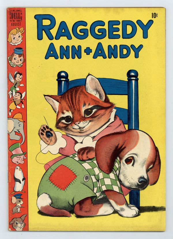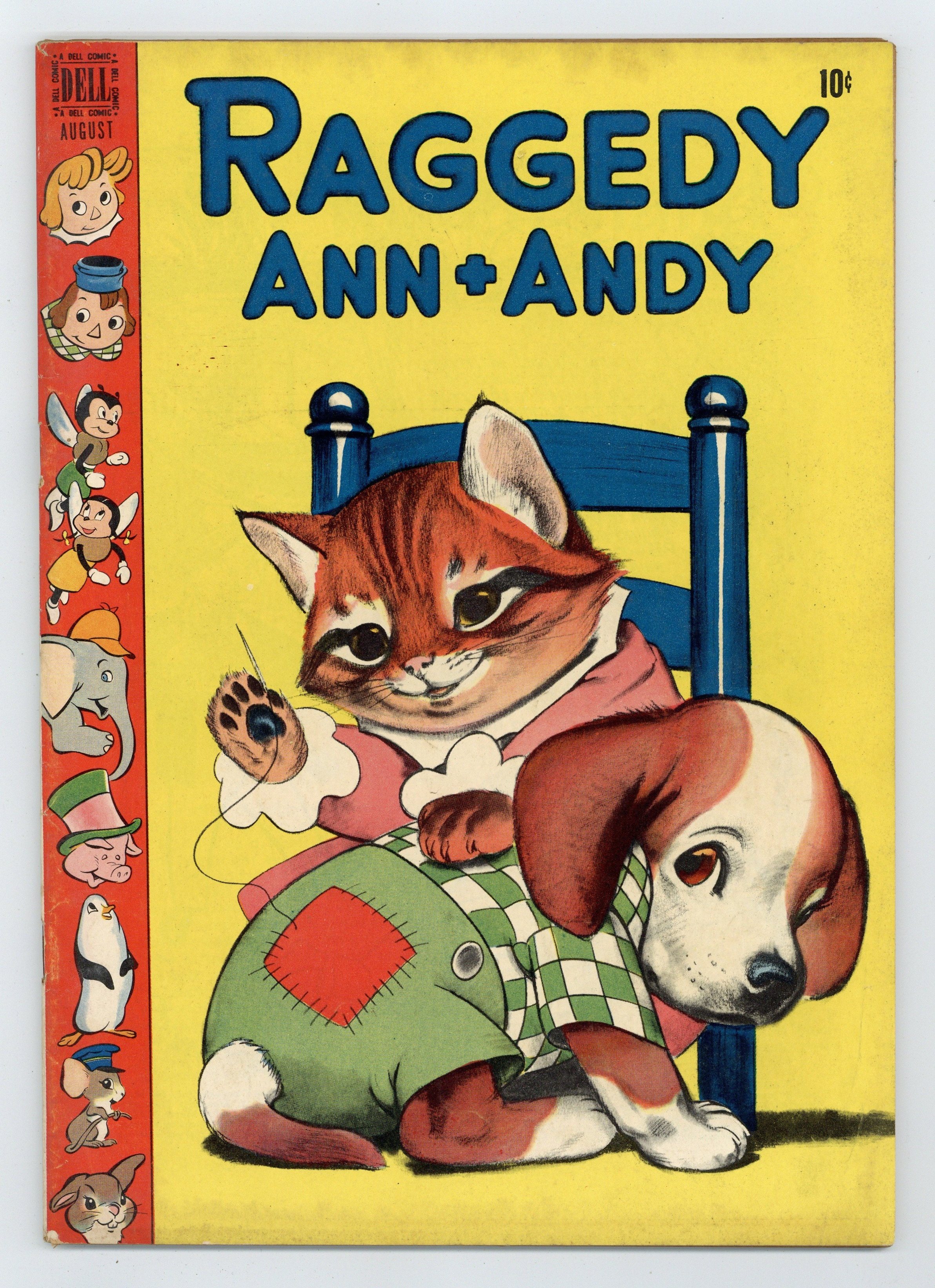 Stories and art by Walt Kelly, Morris Gollub, Mary Greenwalt, Elizabeth Coatsworth, Frank Jupo and Dan Noonan. Johnny Gruelle's famous doll characters have adventures and learn lessons, featuring early art from Walt Kelly. Legendary Pogo artist Walt Kelly adapts Mother Goose nursery rhymes, including Pease, Porridge and The Circus. After the Loonies tear the Calico Dragon to pieces, Raggedy Ann and Andy ask if the gnomes can stitch him together again – after all, they are patchwork toys. A retelling of a classic Laplander folk tale, The Red Hot Star. Plus activity pages and "nonesuch" animals. The Kitten Stand; Raggedy Ann; Egbert Elephant; What Makes a Bullfrog Croak?; The Red Hot Star; The Raggedy Way; Animal Mother Goose; None-Such Animals: The Prandle; Billy and Bonny Bee. 48 pages, Full Color. Cover price $0.10.