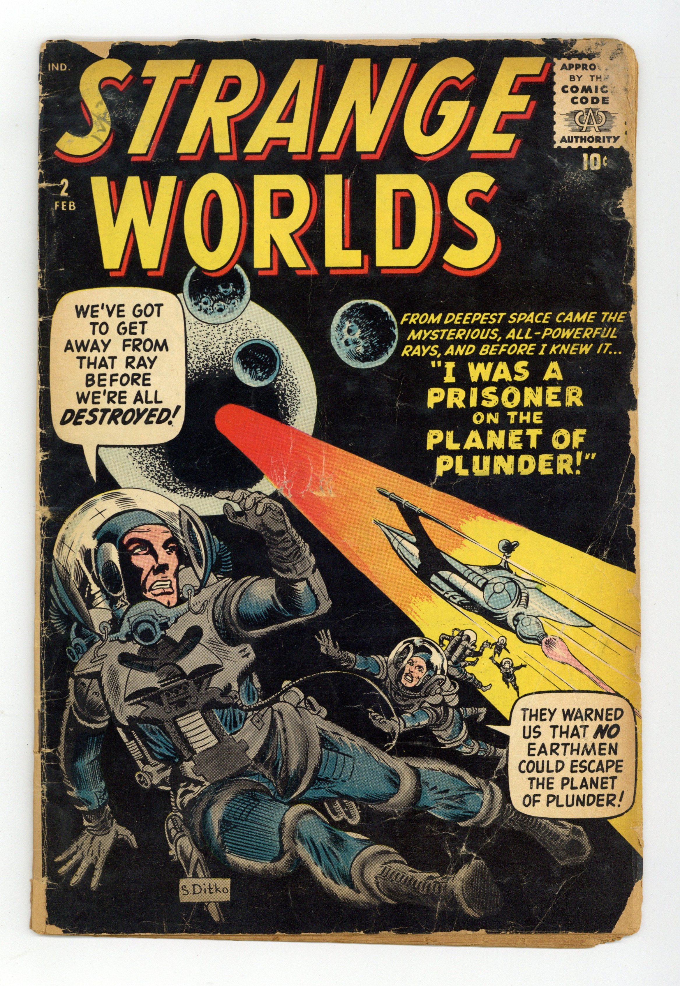 Cover by Steve Ditko. "I Was a Prisoner on the Planet of Plunder!", art by Don Heck; An interstellar detective takes a cargo pilot's place to find out how ships are being robbed without anyone remembering anything. "Strange Mission" text story, art by Joe Maneely. "I Was the Miracle Man"; A brilliant but cruel businessman sets out to conquer an alien world. "I Saw the Day the World Ended!"; A machine seems to show the end of the world when the Sun burns out in the future. "The Little Lost Planet," art by Steve Ditko; A tiny lost planet does good deeds on Earth until it is located by its mother planet and returned to its home galaxy. "I Am the Scourge of Atlantis!", art by Dick Ayers; The king of Atlantis is convinced that life still exists on the surface and leads an invasion fleet to make war on the world above. 36 pgs., full color. $0.10. Cover price $0.10.
