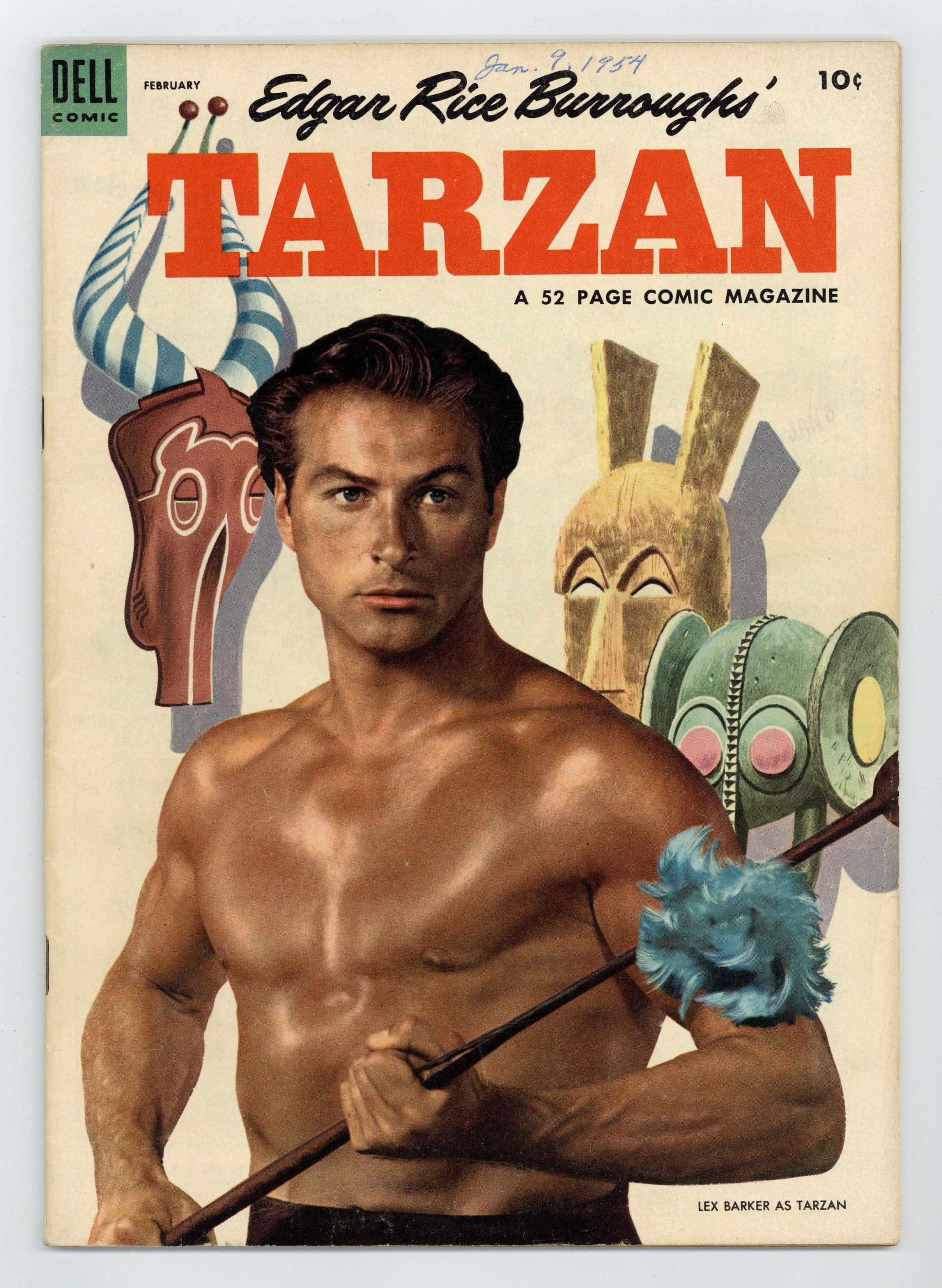Published Feb 1954 by Dell/Gold Key.$16.00Lex Barker photo cover. "Tarzan and the King Panther," script by Gaylord Du Bois, art by Jesse Marsh; A member of a leopard cult kidnaps Jane in order for her to serve as a sacrifice the Black King, embodiment of the leopard god; Tarzan pursues them, frees Jane, and kills the Black King. "Boy Delivers a Letter," script by Gaylord Du Bois, art by Jesse Marsh; Boy and Dombie deliver what they think is an urgent letter to Tarzan, who is away from home arbitrating a village disagreement. "Tarzan and the Ancient Weapon," script by Gaylord Du Bois, art by Jesse Marsh; Gangsters from the outside world take over Luton; Soon, Tarzan arrives and set things right, exiling the gangsters to an island in the Great Swamp. "Manga Hunt" text story starring Mabu. Untitled Brothers of the Spear story, script by Gaylord Du Bois, art by Russ Manning; Dan-El and Natongo struggle to get out of the extinct volcano crater they have been trapped in. Geckos illustration by Jesse Marsh. 52 pages, full color. Cover price $0.10.