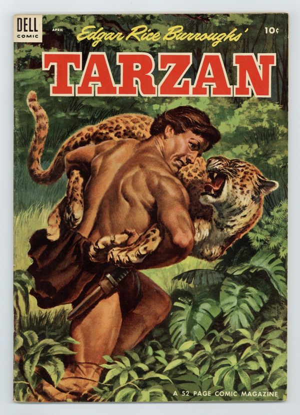 Published Apr 1954 by Dell/Gold Key.$15.25Painted cover art by Morris Gollub. "Tarzan and the Crossbows of Karfu," script by Gaylord Du Bois, art by Jesse Marsh; Tarzan and Dr. MacWhirtle's plane is forced down by crossbow fire from the village of Karfu; The people of Karfu have long enslaved their neighbors, the Naquis, and enslave Tarzan and MacWhirtle. "Boy and the Leopard's Call," script by Gaylord Du Bois; Dombie's sister, Lula, is carried off by a she-mangani; Boy and Dombie trail them and retrieve Lula. "Tarzan and the Isle of Apes," script by Gaylord Du Bois, art by Jesse Marsh; Tarzan rescues a group of mangani taken by raiders for an animal buyer. "Day of Departure" text story starring Mabu. Untitled Brothers of the Spear story, script by Gaylord Du Bois, art by Russ Manning; Dan-el and Natongo follow an underground river, hoping that it will lead them out of the extinct volcano. 52 pages, full color. Cover price $0.10.