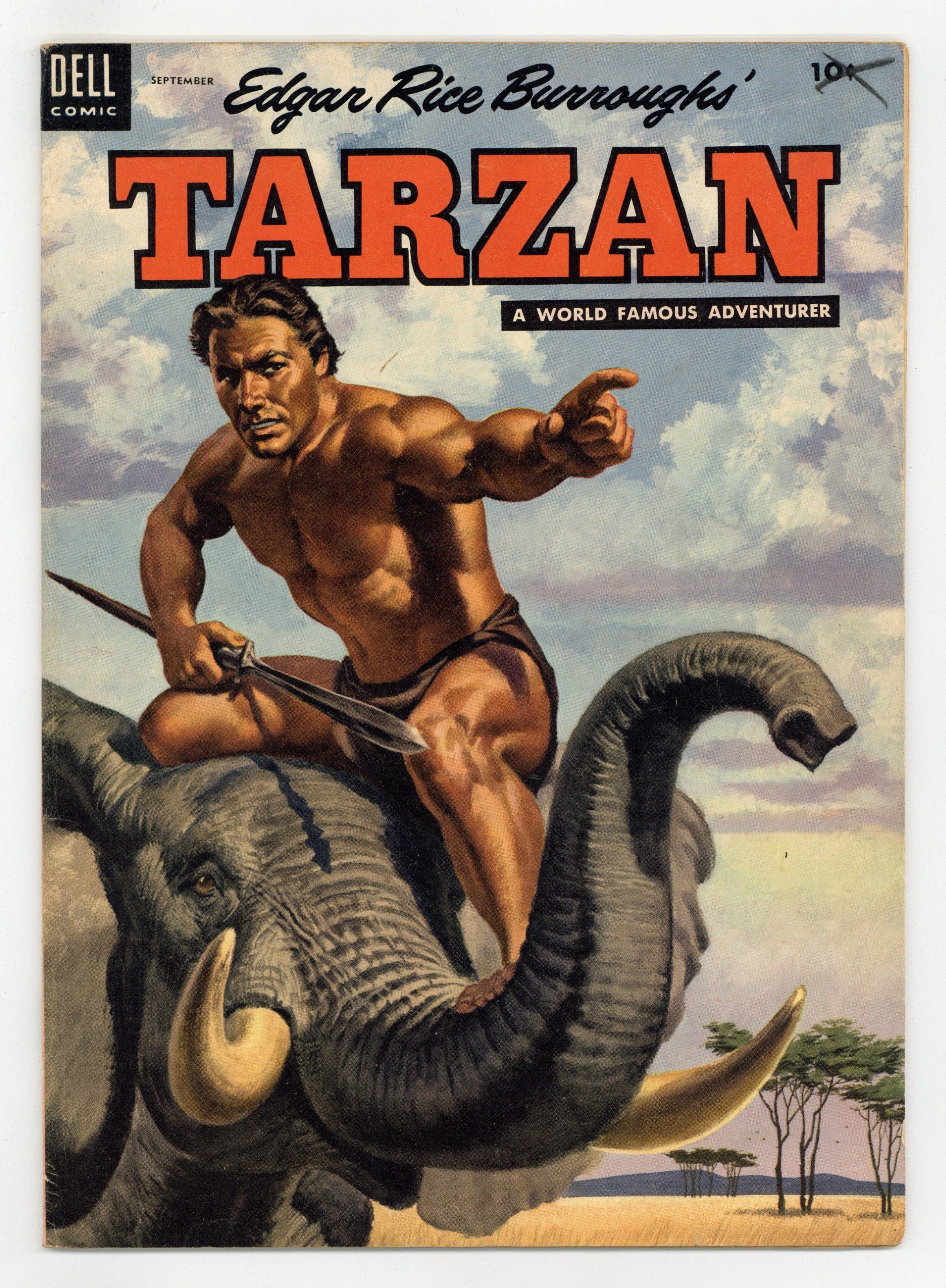 Published Sep 1954 by Dell/Gold Key.$21.00Painted cover art by Morris Gollub. Tarzan's World illustration by Jesse Marsh. "The Bolas of Monga," script by Gaylord Du Bois, art by Jesse Marsh; When Jorah and his men are captured by the Mongan tribe, Tarzan rescues them. "Boy Plays Hide and Seek," script by Gaylord Du Bois, art by Jesse Marsh; When his mate Balja is captured by hunters, Jad-Bal-Ja and Boy travel to the city to rescue her. "Arrival" text story starring Mabu by Elizabeth Beecher. Untitled Brothers of the Spear story, script by Gaylord Du Bois, art by Russ Manning; Dan-El and Natongo stop an attempt to kill Prince Mohaffa. 36 pages, full color. Cover price $0.10.