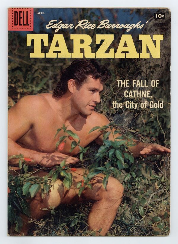 Cover price is 10 cents. Gordon Scott photo cover. Manu the Monkey illustration by Jesse Marsh. "Tarzan and the Fall of Cathne," script by Gaylord Du Bois, art by Jesse Marsh; An earthquake devastates Cathne and the city of the Gallegos; The two join forces to defeat a marauding gorilla army. "The Magic of the Water" text story starring Mabu. "Tarzan and the Smoking Cliff," script by Gaylord Du Bois, art by Jesse Marsh; Boy and Dombie stumble across a leopard cult and are rescued by Tarzan. Untitled Brothers of the Spear story, script by Gaylord Du Bois, art by Russ Manning; Tavane helps Dan-El rescue his small force from a Galla raiding party. Bolgani Gray Ape illustration by Jesse Marsh. 36 pages, full color. Cover price $0.10.