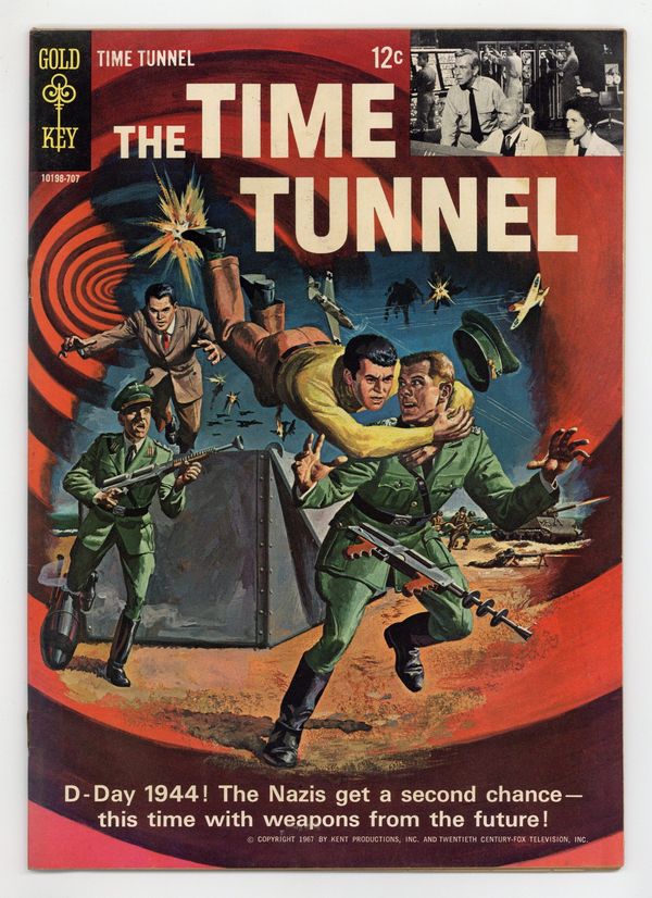 Number/month on cover: 10198-707, no month listed. Comic book version of the Irwin Allen 1960s sci/fi-fantasy TV series in which two scientists are hurled into the lost world of time. Issue has "The Conquerors" in which Doug and Tony end up in the future and discover a plot to go back in time and help the Nazis win World War II and "The Captives" in which the pair end up stuck in the middle of a conflict between Indians and General George Custer. Issue also has one-page gag and educational features. Back cover and inside covers have photo pinups. Story and art credits: unknown. Cover price $0.12.