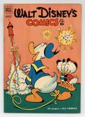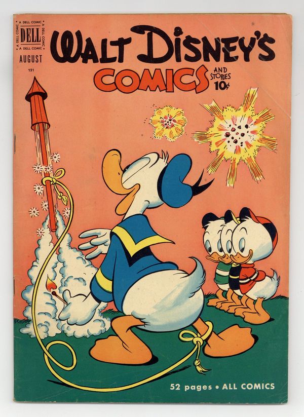 Cover by Carl Barks. Stories and art by Carl Barks, Bill Walsh, Manuel Gonzales, Bob Karp, Don Christensen, Gil Turner, Bob Moore, Bill Wright, and Al Taliaferro. Sometimes listed as Vol. 11 #11. The long-running vehicle for Disney character comics featured art by Carl Barks, the legendary Good Duck Artist. Mickey investigates the strange disappearances on Man-eater Mountain. In a story by Barks, Donald can't believe his good luck as he competes against Gladstone in a golf tournament. Donald's nephews convince him they have a real flying carpet. Donald Duck; Grandma Duck; Li'l Bad Wolf; Mickey Mouse; Greased Lightnin'; Mickey Mouse: The Ghost of Man-eater Mountain. 48 pages, Full Color. Cover price $0.10.