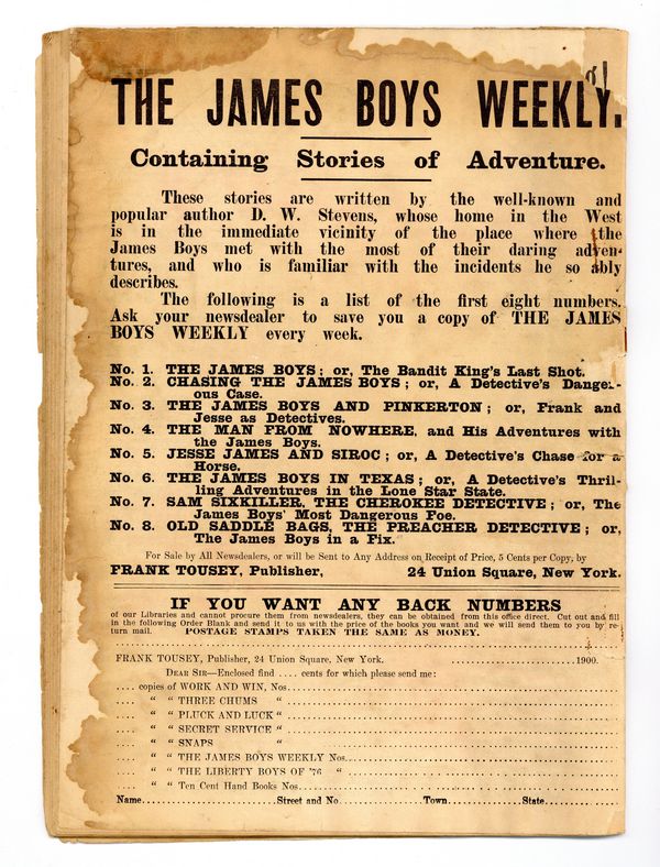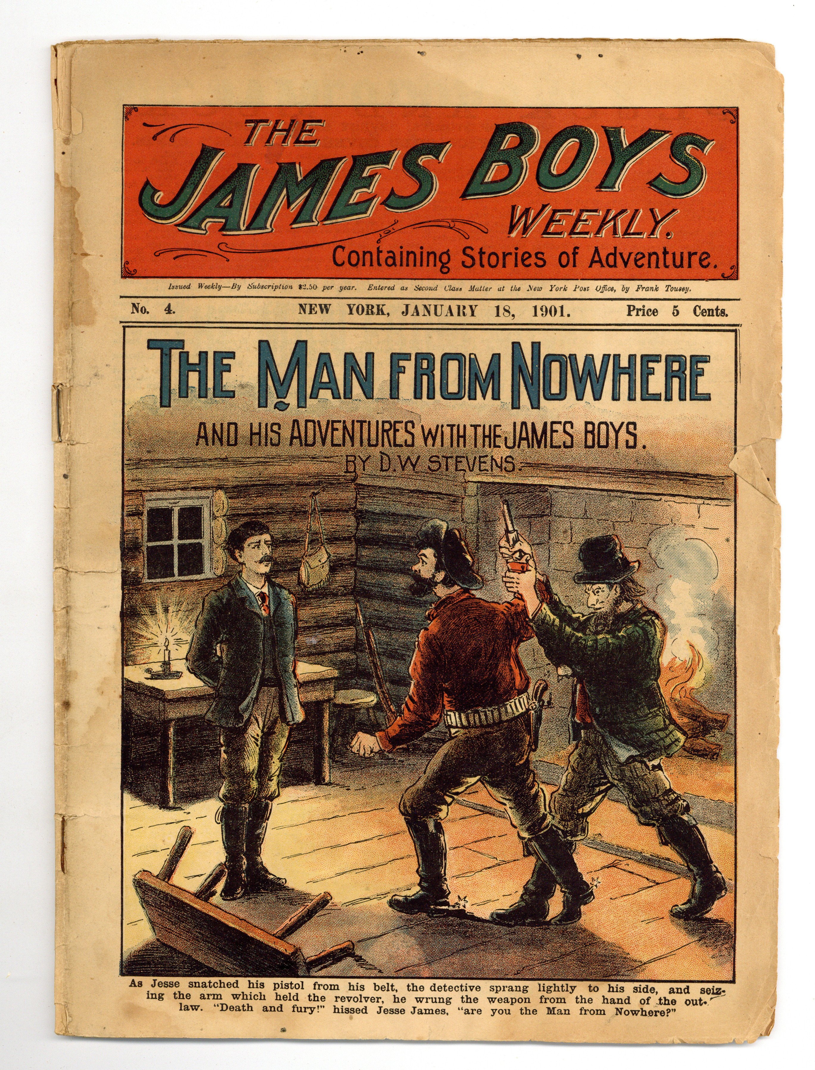 January 18, 1901. Daring adventures of the James Boys. In this issue: The Man from Nowhere and his Adventures with the James Boys - by D.W. Stevens (Pseudonym used by John. R. Musick). 11 1/4" x 8", 32 pages, B&W. Cover price $0.05.