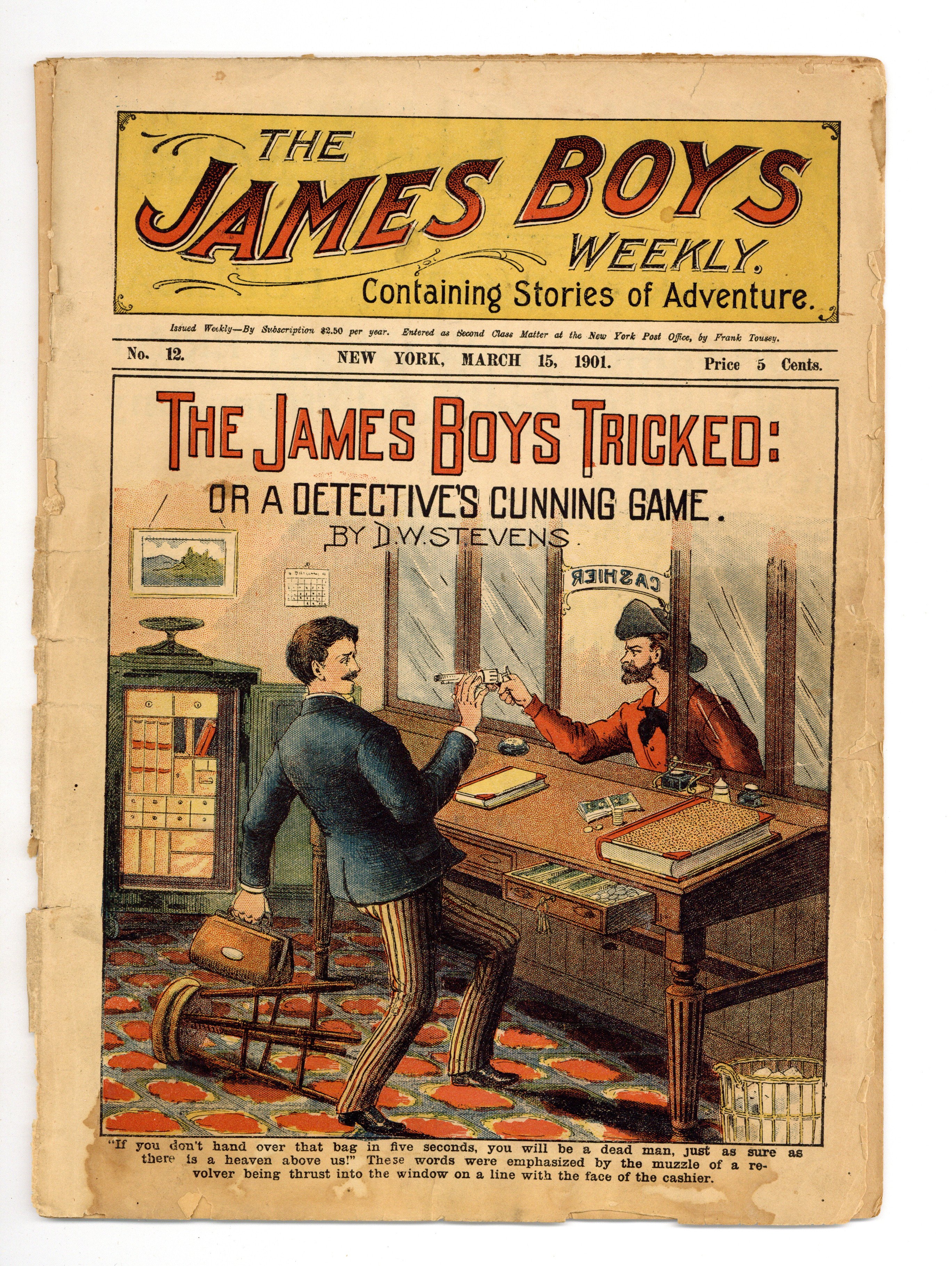 March 15, 1901. Daring adventures of the James Boys. In this issue: The James Boys Tricked; or, A Detective's Cunning Game - by D.W. Stevens (Pseudonym used by John. R. Musick). 11 1/4" x 8", 32 pages, B&W. Cover price $0.05.