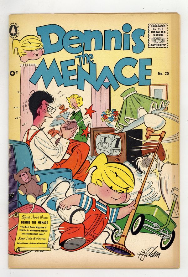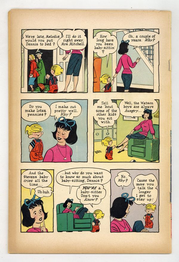 Cover art by Hank Ketcham. Reprints of daily Dennis the Menace cartoons by Hank Ketcham. Dennis...All American Boy starring Dennis the Menace, script by Fred Toole, art by Al Wiseman. Indian Summer starring Dennis the Menace, script by Fred Toole, art by Al Wiseman. Trial by Fire text story. Screamy Mimi, art by Al Wiseman; Mimi enters the "Zippy-Oats" yelling contest. Ruff, script by Fred Toole, art by Al Wiseman. 36 pgs. $0.10. Cover price $0.10.