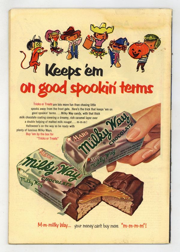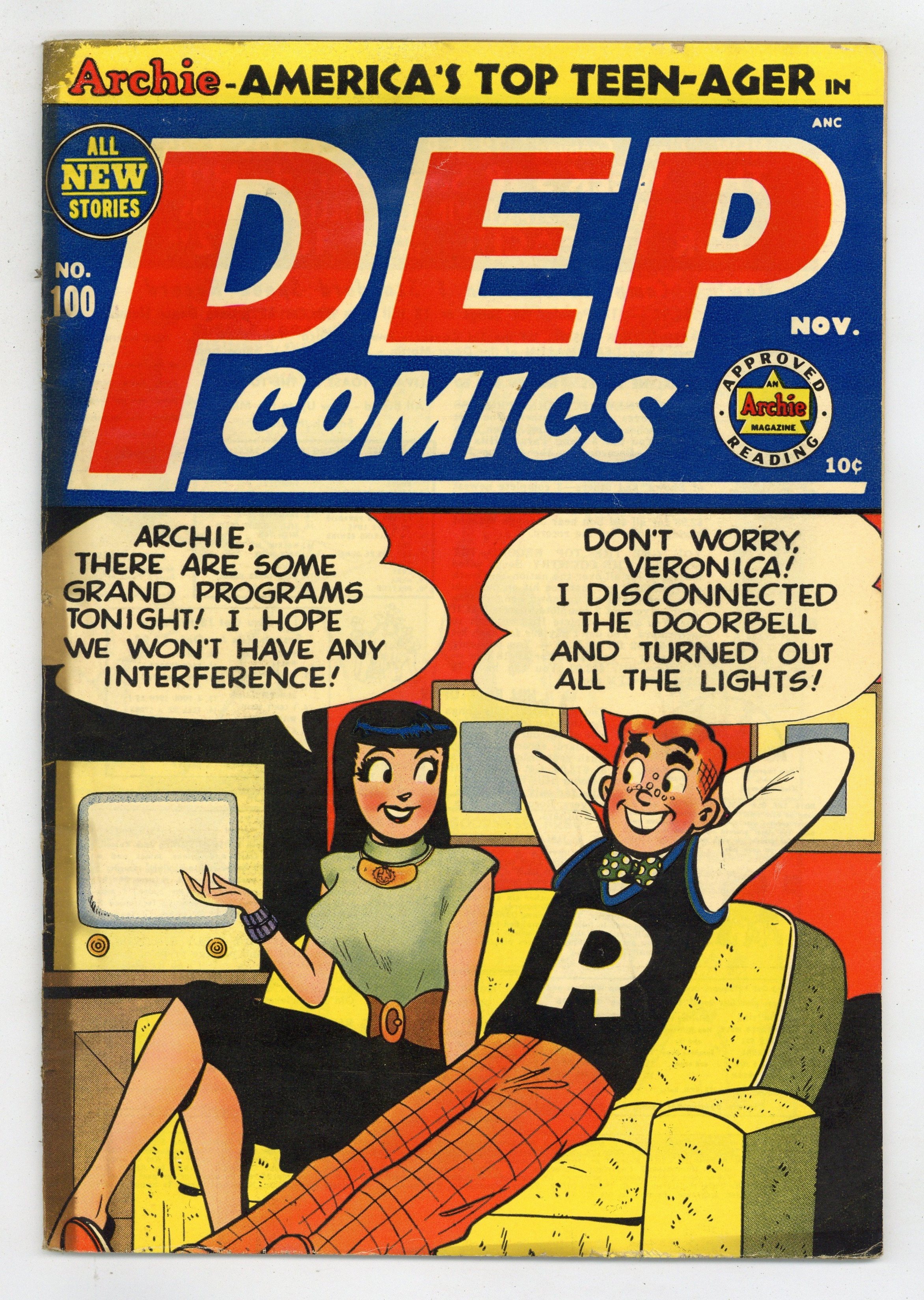 "Book Wormer"; Archie and Mr. Weatherbee have a crush on the same teacher, Miss Honeydew; It leads to Mr. Weatherbee getting knocked out by a plumber. "The Millionaire"; Archie turns in his report answering what he would do if he had a million dollars. "Pie Ala Rogue"; Betty bets Archie that she can get Jughead to take her on a date; She gets a date with him to a pie eating contest. Untitled story, script and art by Bill Woggon; At the dance Gloria tricks Katy Keene into ripping the front of her dress. "The Quiz Kid"; Wilbur gives Red a friendship test and he fails. "A Coat of Arms!"; Wilbur asks for help to keep Laurie warm. "No Park-Ing"; Ferdy goes to great lengths to spend time with Suzie on the park bench. "All Tied Up," script and art by Joe Edwards; Li'l Jinx gives her dad a tie that ends up costing him two-hundred dollars. 36 pgs., full color. Cover price $0.10.