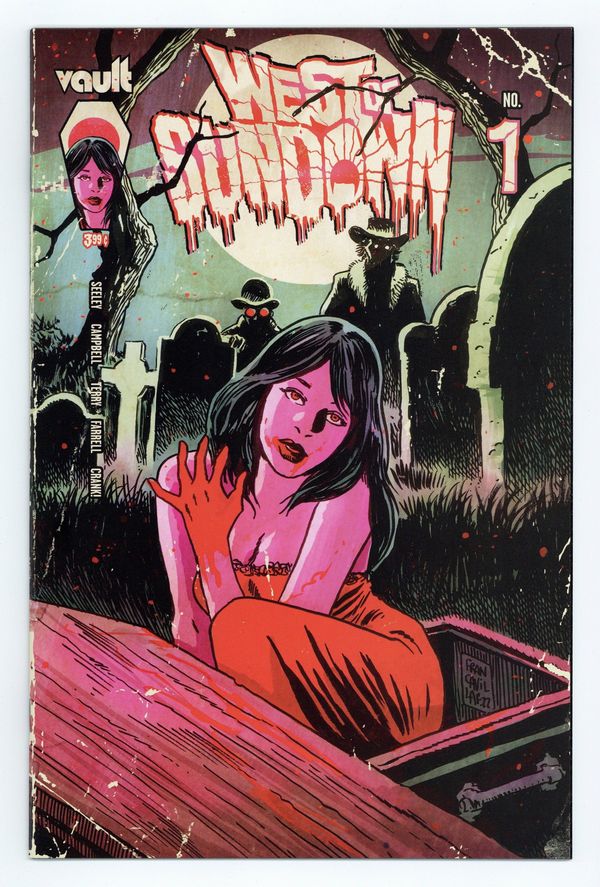 Tags: VampiresPublished Apr 2022 by Vault Comics.$12.00Limited 1 for 75 Retailer Incentive Variant Cover. Written by Tim Seeley, Aaron Campbell. Art by Jim Terry. Cover by Francesco Francavilla. A beautiful vampire must flee monster slayers in New York City and reclaim the ancestral soil that restores her undead flesh. But the world has changed since she was reborn in the New Mexico desert, and now Constance der Abend and her loyal assistant Dooley must adapt to life in the rough frontier town of Sangre de Moro, where all sorts of monsters have settled. A western tale of survival starring a cast of literary horrors from the diabolical minds of Tim Seeley, Aaron Campbell, and Jim Terry. 24 pages, full color. Cover price $3.99.