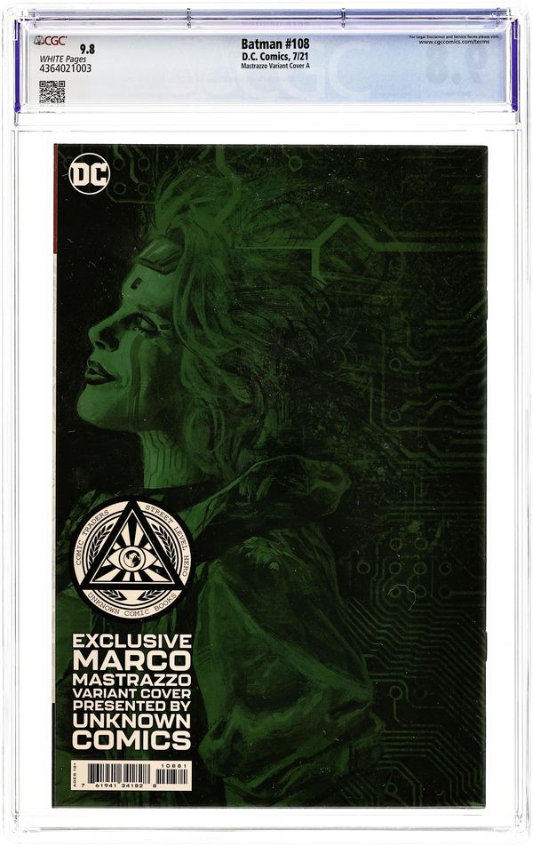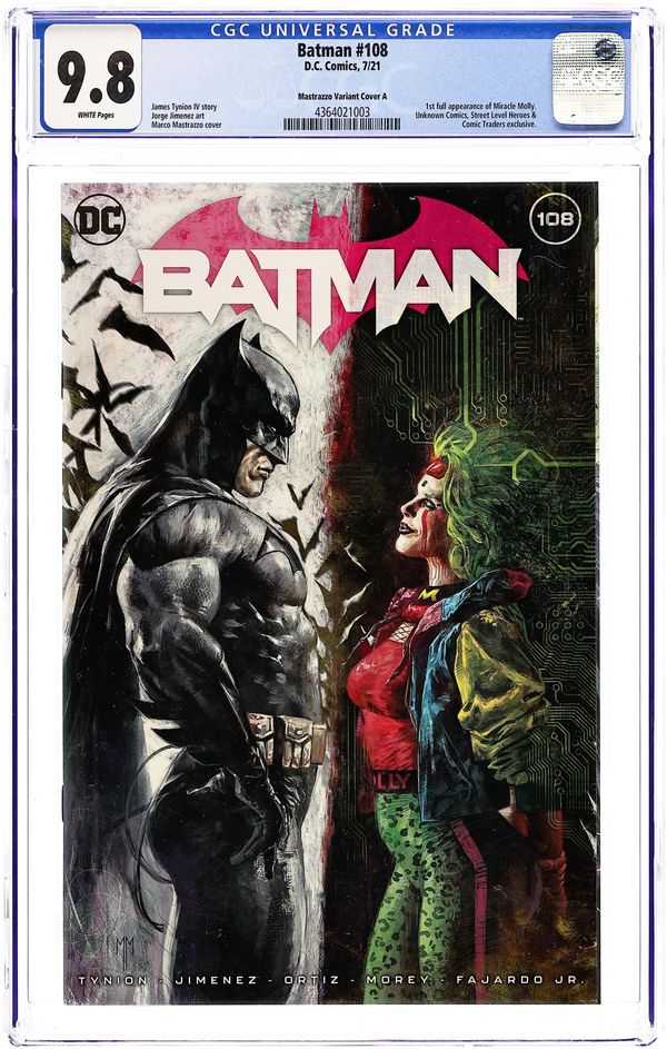 Comics Illuminati (Unknown Comics, Comic Traders, and Street Level Hero) exclusive cover by Marco Mastrazzo. Written by James Tynion IV. Art by Jorge Jimenez, Ricardo Lopez Ortiz. Batman goes undercover to infiltrate the transhumanist gang known as the Unsanity Collective and learn more about their sudden appearance in Gotham. And what nefarious plans does Simon Saint have for Arkham Day survivor Sean Mahoney? How does it connect to the Magistrate? And in part two of the action-packed, bone-rattling Ghost-Maker backup story...can our hero stand up to the horror of Kid Kawaii? Plus, dont miss the debut of the mysterious Miracle Molly! 40 pages, full color. Rated T+