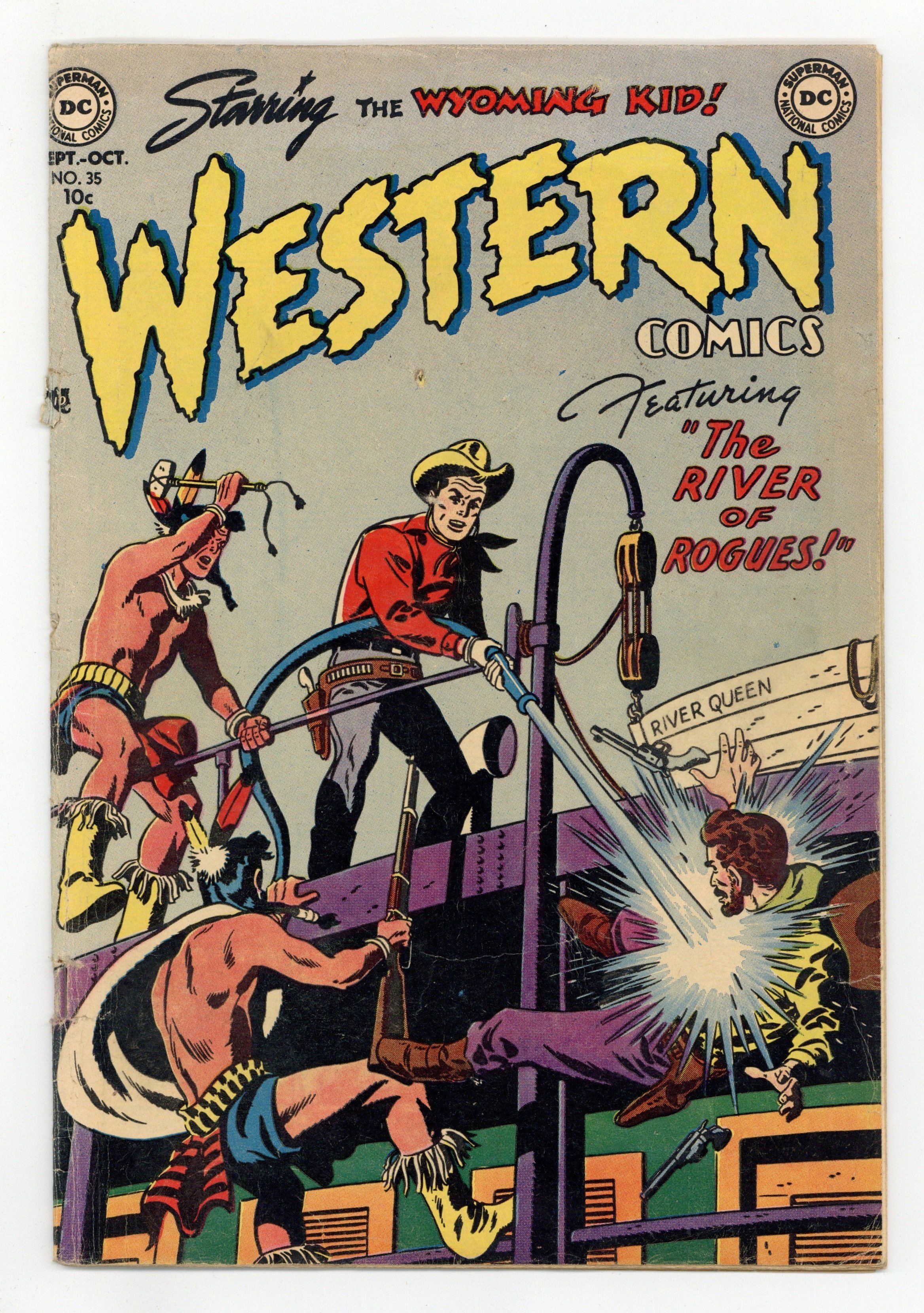 Cover art by Howard Sherman. The River of Rogues starring the Wyoming Kid, script by Gardner Fox, art by Howard Sherman. The Trail of the Three Killers starring Cowboy Marshal, art by Ed Smalle Jr. The Spurs of Sam McGee starring Rodeo Rick, script by Gardner Fox, art by Tom Cooke. The Burro Worth a Fortune starring Nighthawk, script by Don Cameron, art by Ruben Moreira. $0.10. Cover price $0.10.