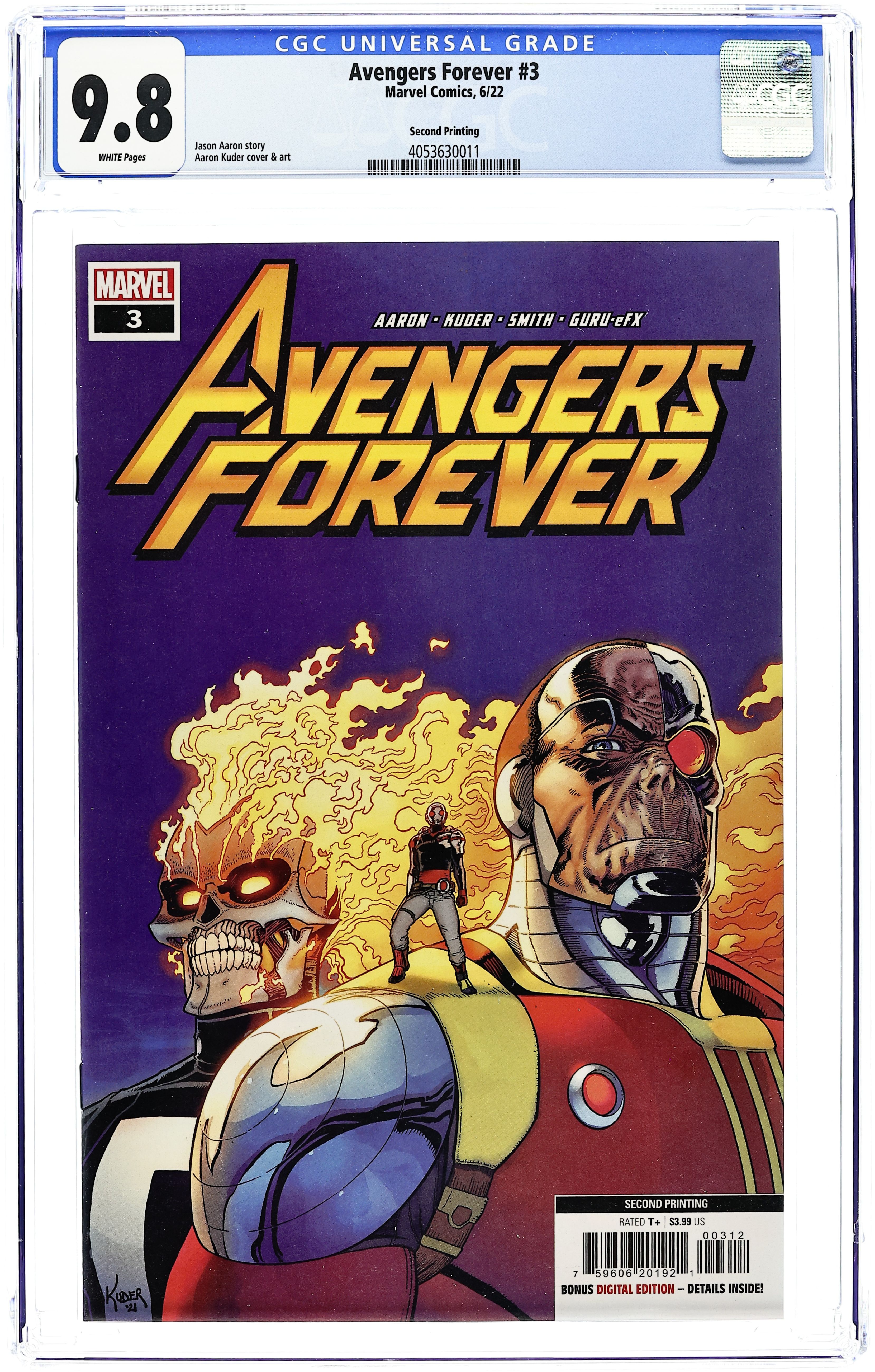 2nd Printing. Written by Jason Aaron. Art by Aaron Kuder. Cover by Aaron Kuder. WAR FOR THE WASTELANDS! Tony Stark, the Invincible Ant-Man. Robbie Reyes, a Ghost Rider unlike any other from across the multiverse, still changing, still becoming what he was always meant to be. A Deathlok who refuses to die. A brutally two-fisted Wonder Man. A half-built Vision. The Infinity Thing. Together, they're all that passes for Earth's Mightiest Heroes on a world overrun by the Black Skull. But on this day, a day unlike any other, they'll have to be enough. 28 pages, full color. Rated T+ Cover price $3.99.