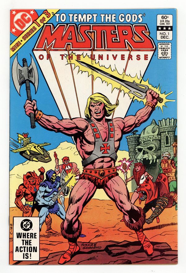 Ends Jan 26 8:56 PM CST Bid History 6 bids Current Bid $22 Your Secret Max Bid If you'd like to bid, please log in or register. Direct Edition. 'To Tempt the Gods!' Written by Paul Kupperberg. Art by George Tuska and Alfredo Alcala. Cover by George Tuska and Dick Giordano. He-Man…Battle-Cat…Man-At-Arms…Teela…Stratos… They are among the mightiest heroes on a world where science and magic meld to form a realm undreamed of. They fight a never-ending battle against the dark warlock Skeletor and his vicious horde of mutants and sorcerers. They fight for the power of Castle Grayskull, an ancient citadel that stands at the apex of time and space. For who should ever hold the power will truly be the Masters of the Universe! 32 pages, FC. Cover price $0.60.