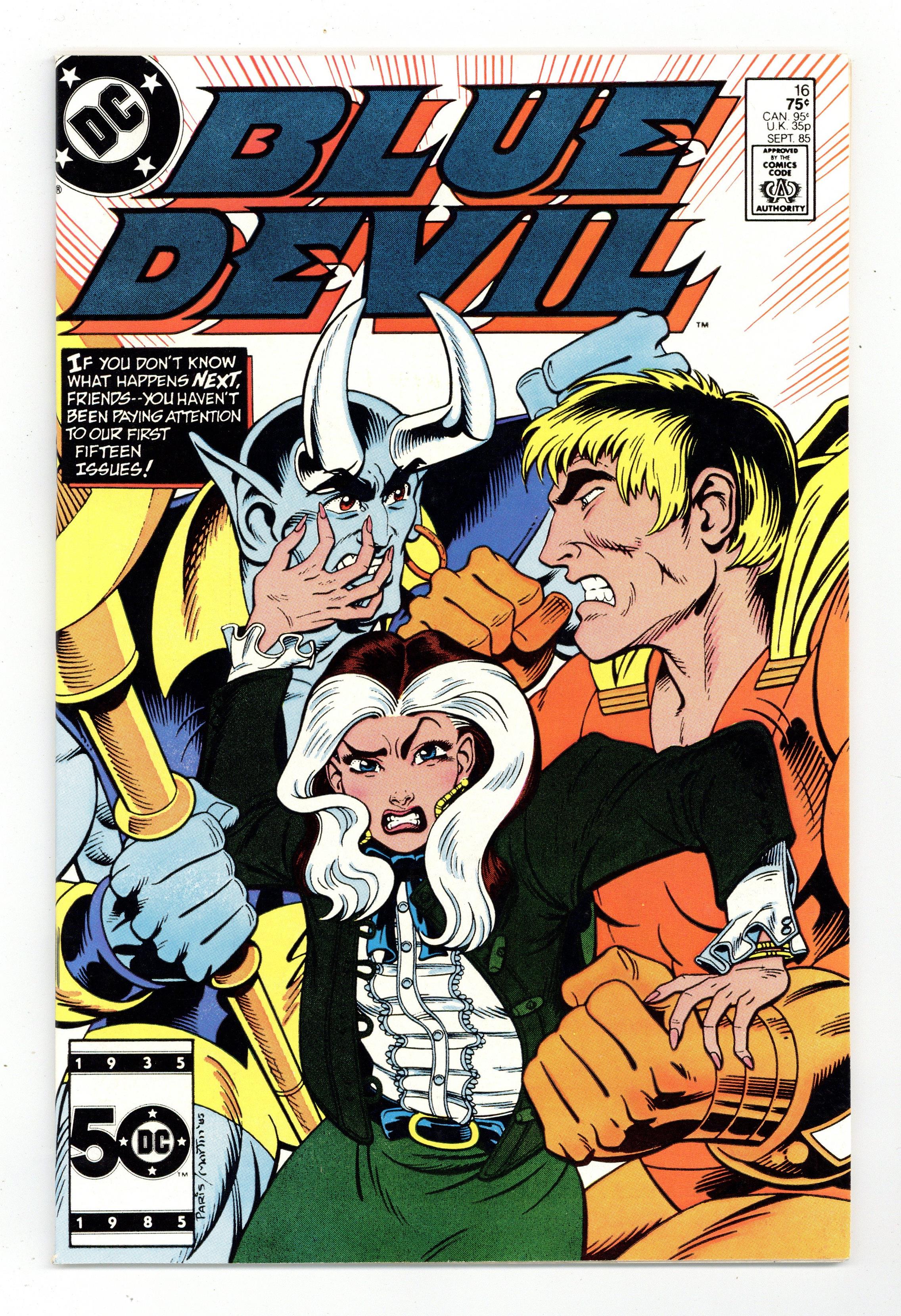 When Verner's Vanquisher abducts Marla, it's Blue Devil (with some unwanted help from Kid Devil) to the rescue in "Damsel In Distress". Part 2 of 2, continued from the previous issue. Script by Gary Cohn and Dan Mishkin, pencils by Alan Kupperberg, inks by Rick Magyar. Bonus insert: 16-page MASK comic by Michael Fleisher, Mike Chen and Joe Delbeato. Paris Cullins/Gary Martin cover. Cover price $0.75.